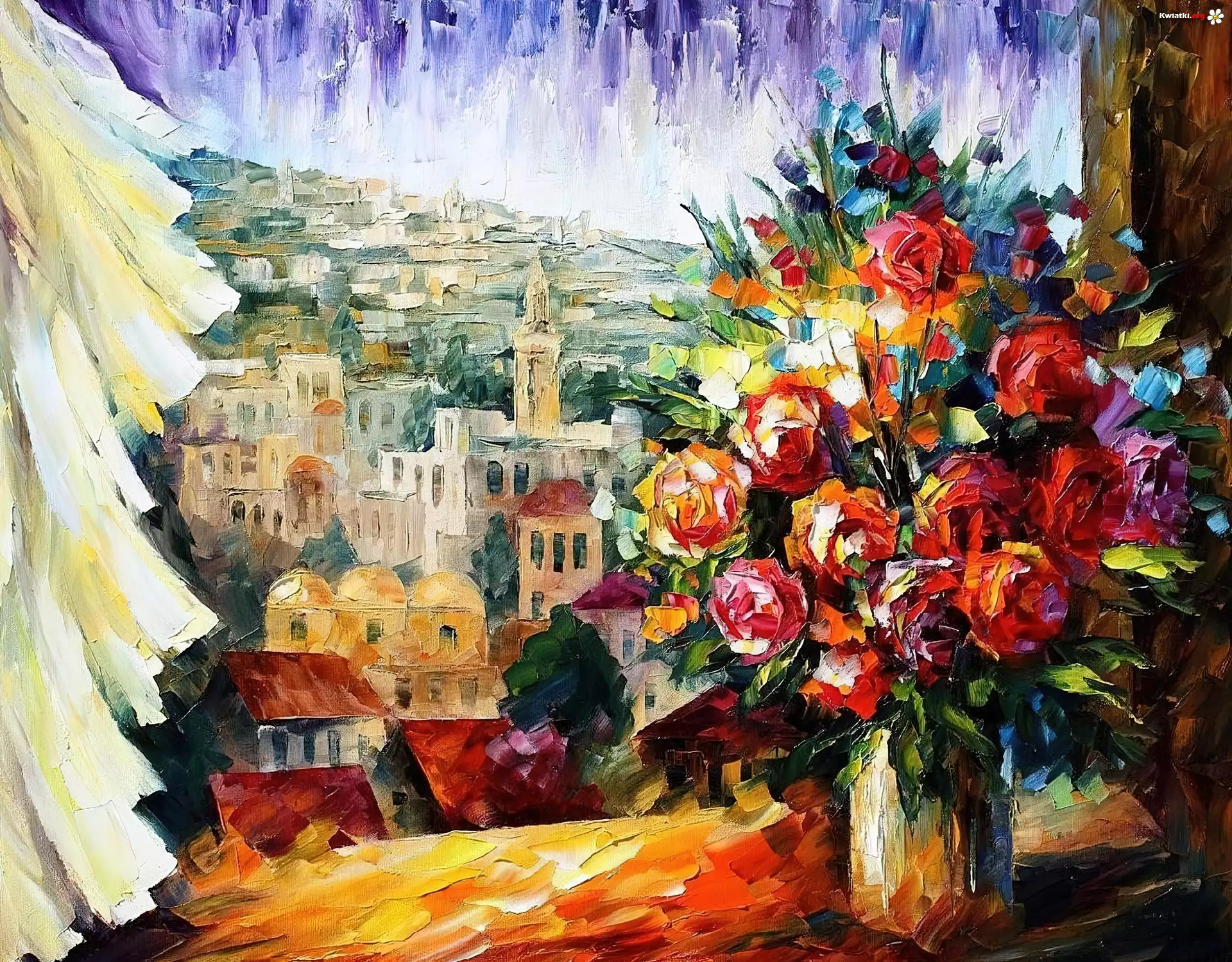 Kwiat Leonid Afremov, Bukiet Kwiatów w Oknie, Obraz