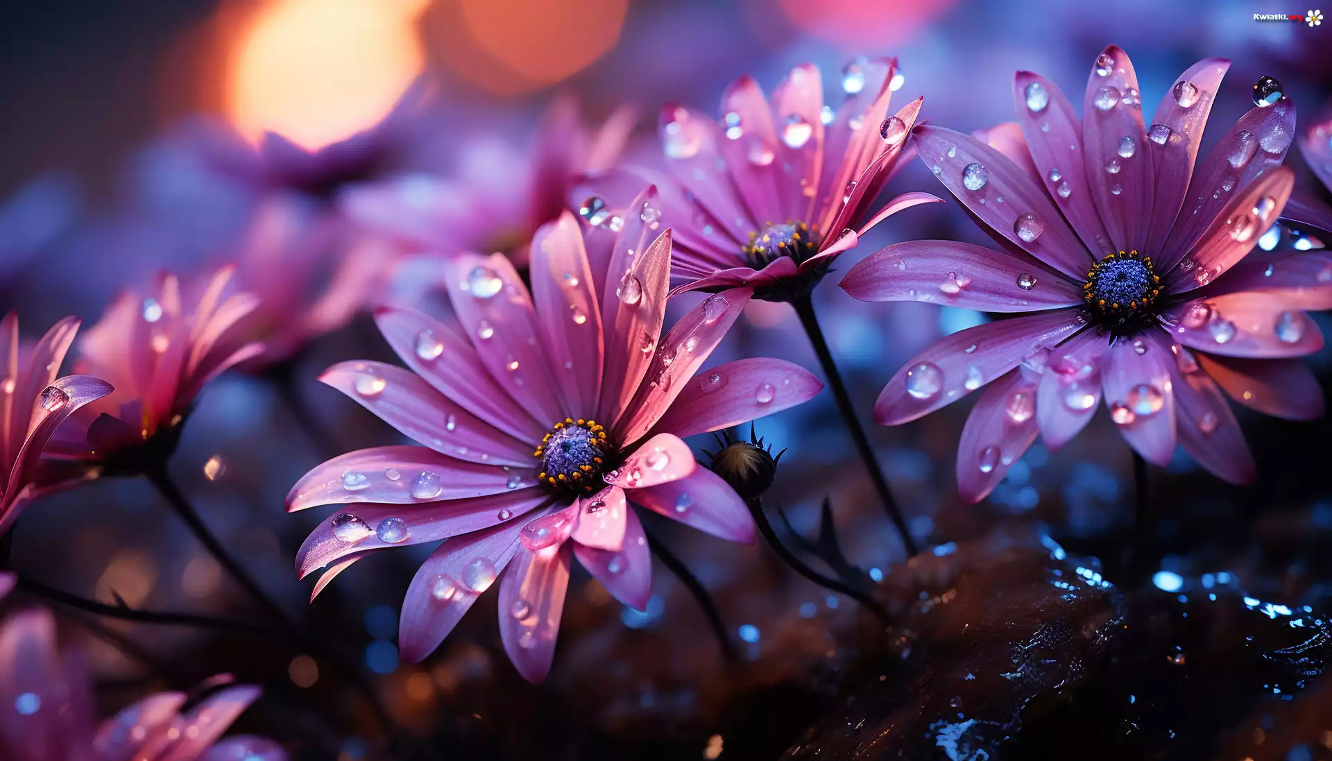 Kwiat Fioletowe, Kwiaty, Stokrotki afrykańskie, Krople, Światło, Grafika