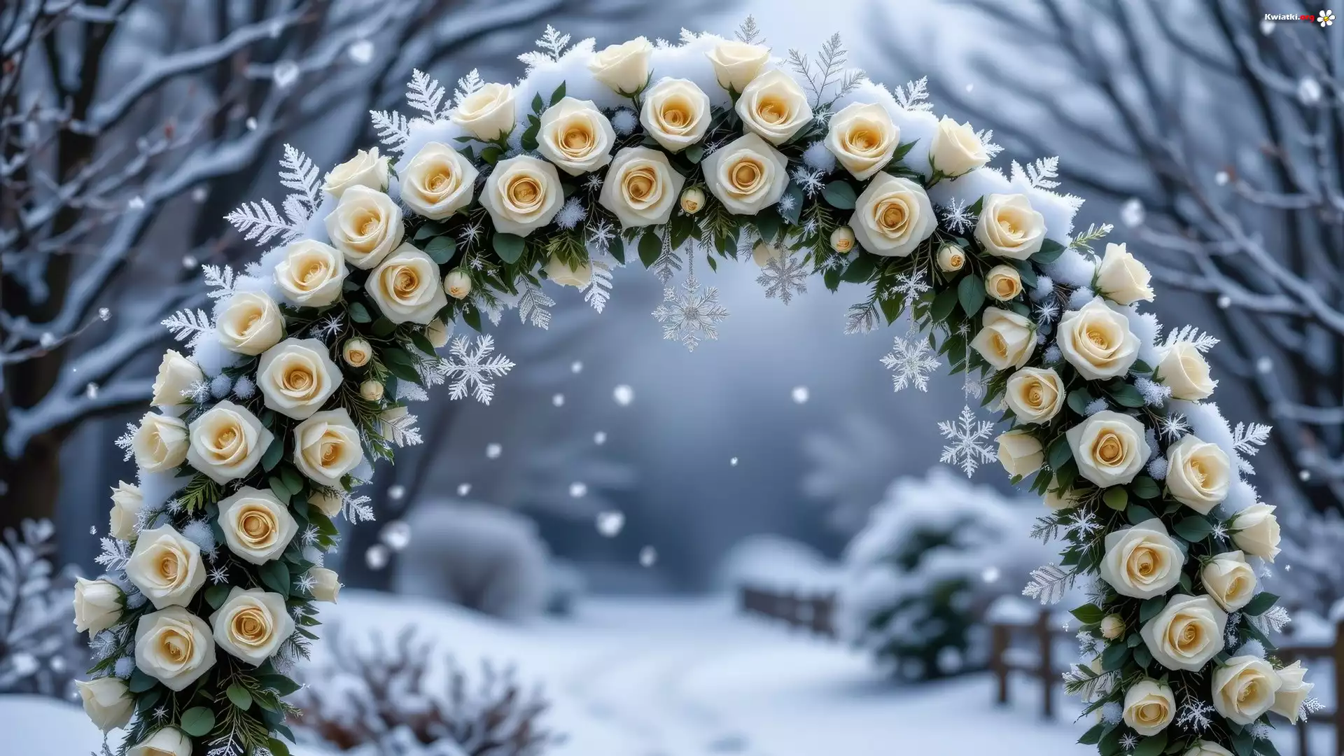 Kwiat Kwiatowy, Łuk, Białe, Róże, Zima, Tło, Grafika AI