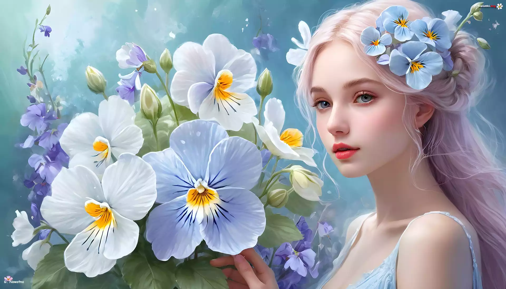Kwiat Młoda, Kobieta, Blondynka, Niebieskie, Białe, Kwiaty, Grafika AI