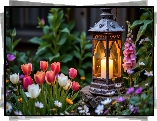 Kwiat Ogród, Lampion, Kamień, Kwiaty, Tulipany, Naparstnica, Stokrotki, AI