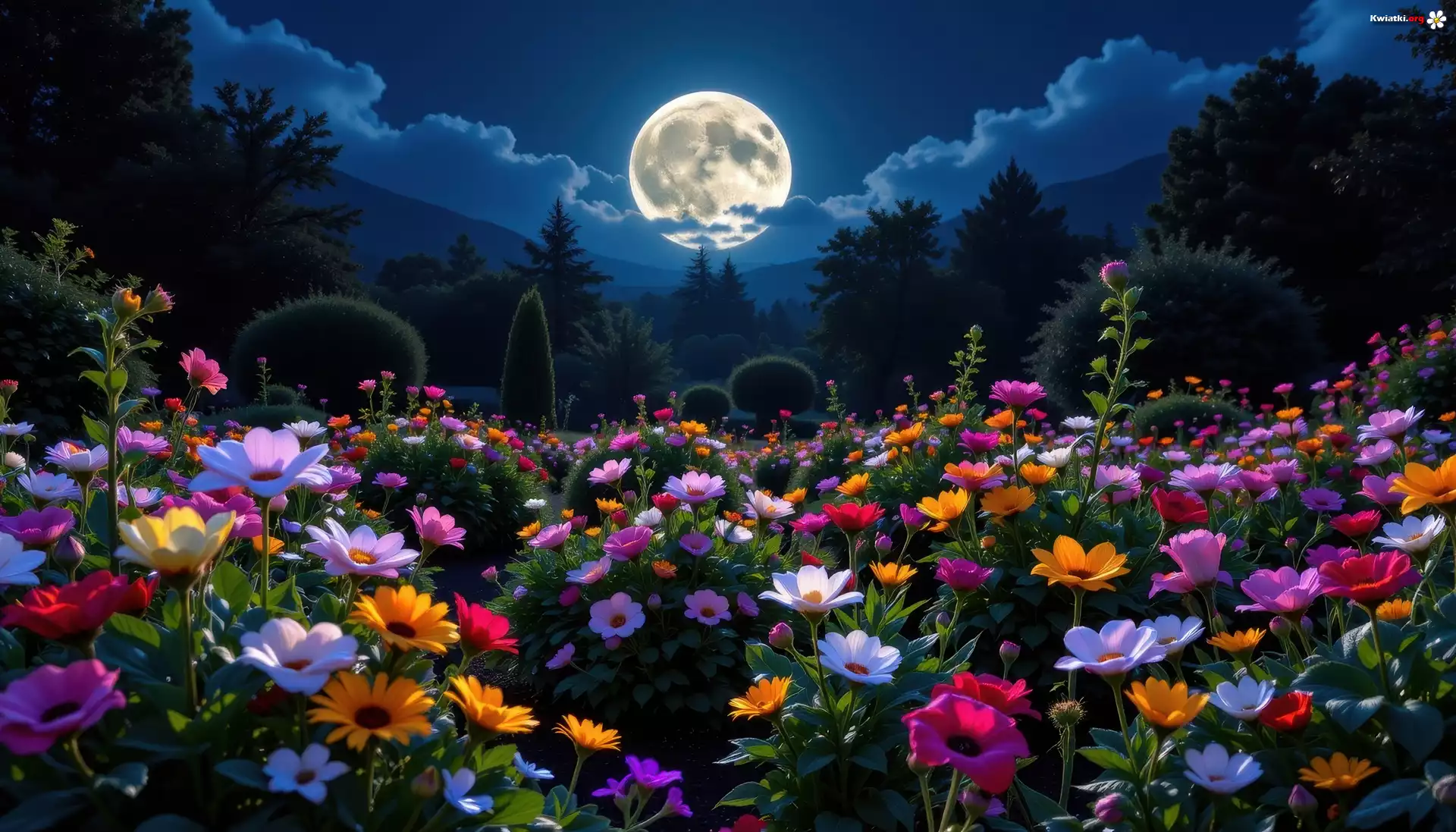 Kwiaty, Kolorowe, Kwiaty, Drzewa, Noc, Księżyc, Grafika AI - Zdjęcia