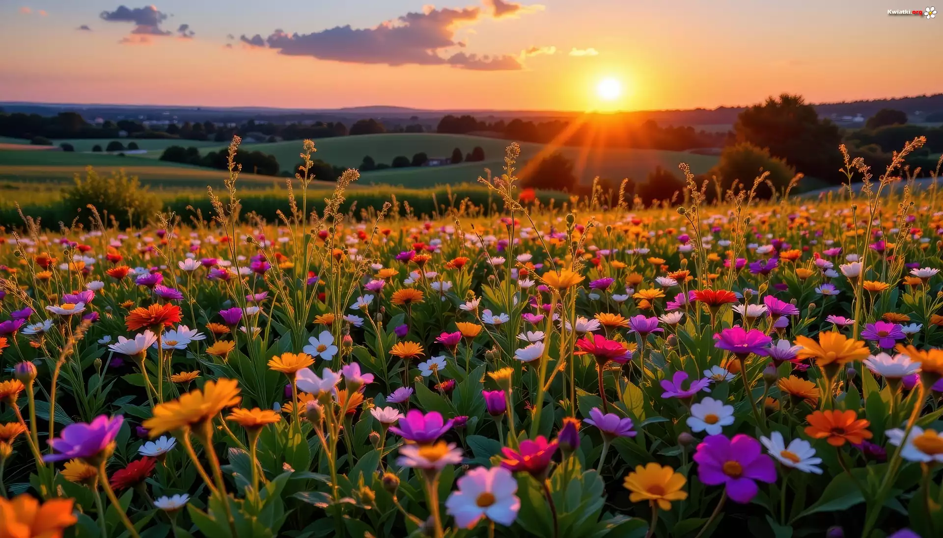 Kwiat Łąka, Kolorowe, Kwiaty, Wzgórza, Zachód słońca, Grafika AI