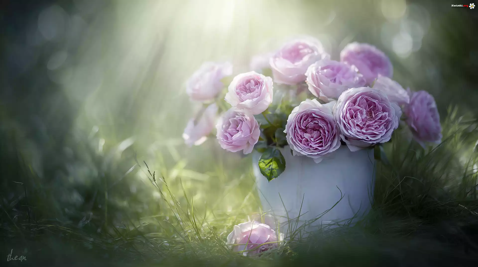 Róże, Różowe, Kwiaty, Biała, Donica, Trawa, Grafika AI - Zdjęcia