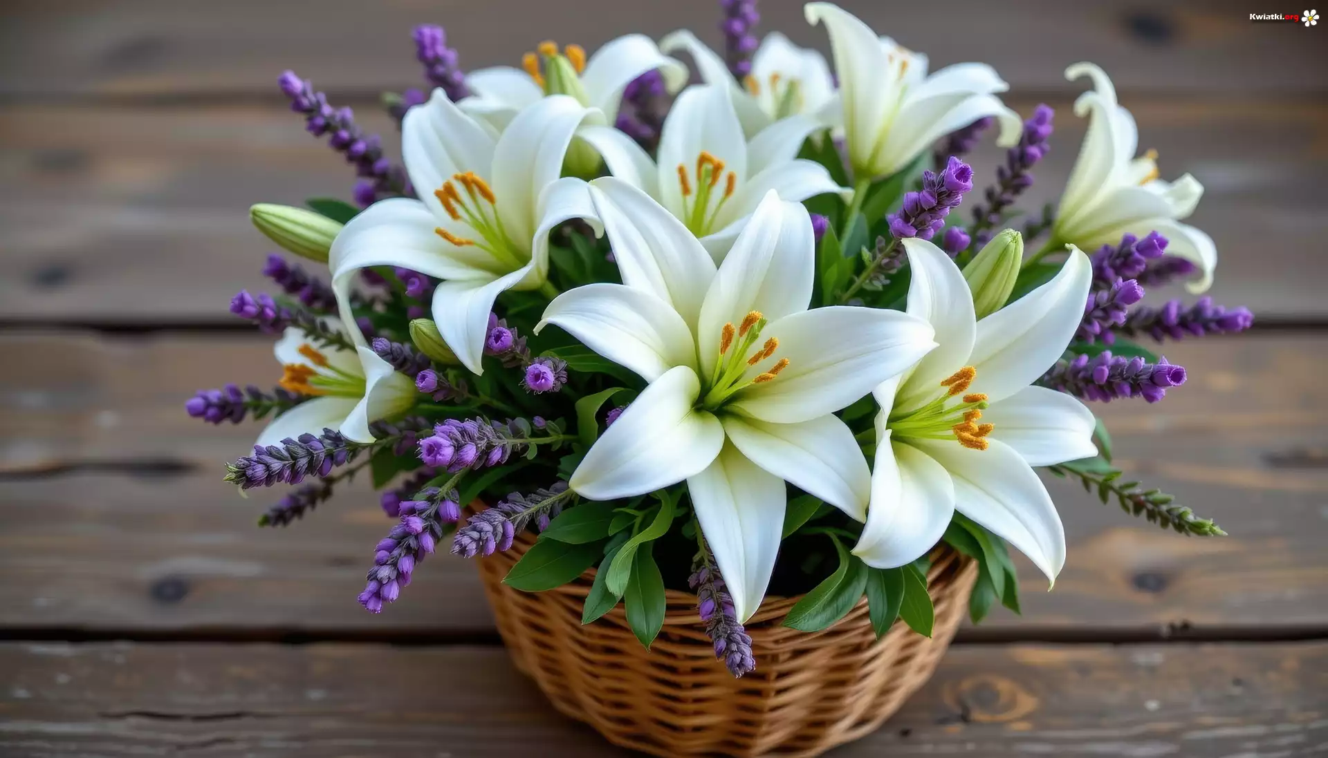 Kwiaty, Białe, Lilie, Lawenda, Bukiet, Koszyk, Grafika AI - Zdjęcia