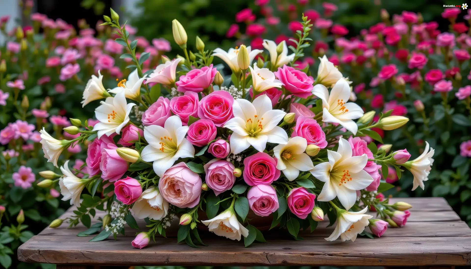 Kwiaty, Róże, Lilie, Piwonie, Bukiet, Stolik, Ogród, AI - Zdjęcia