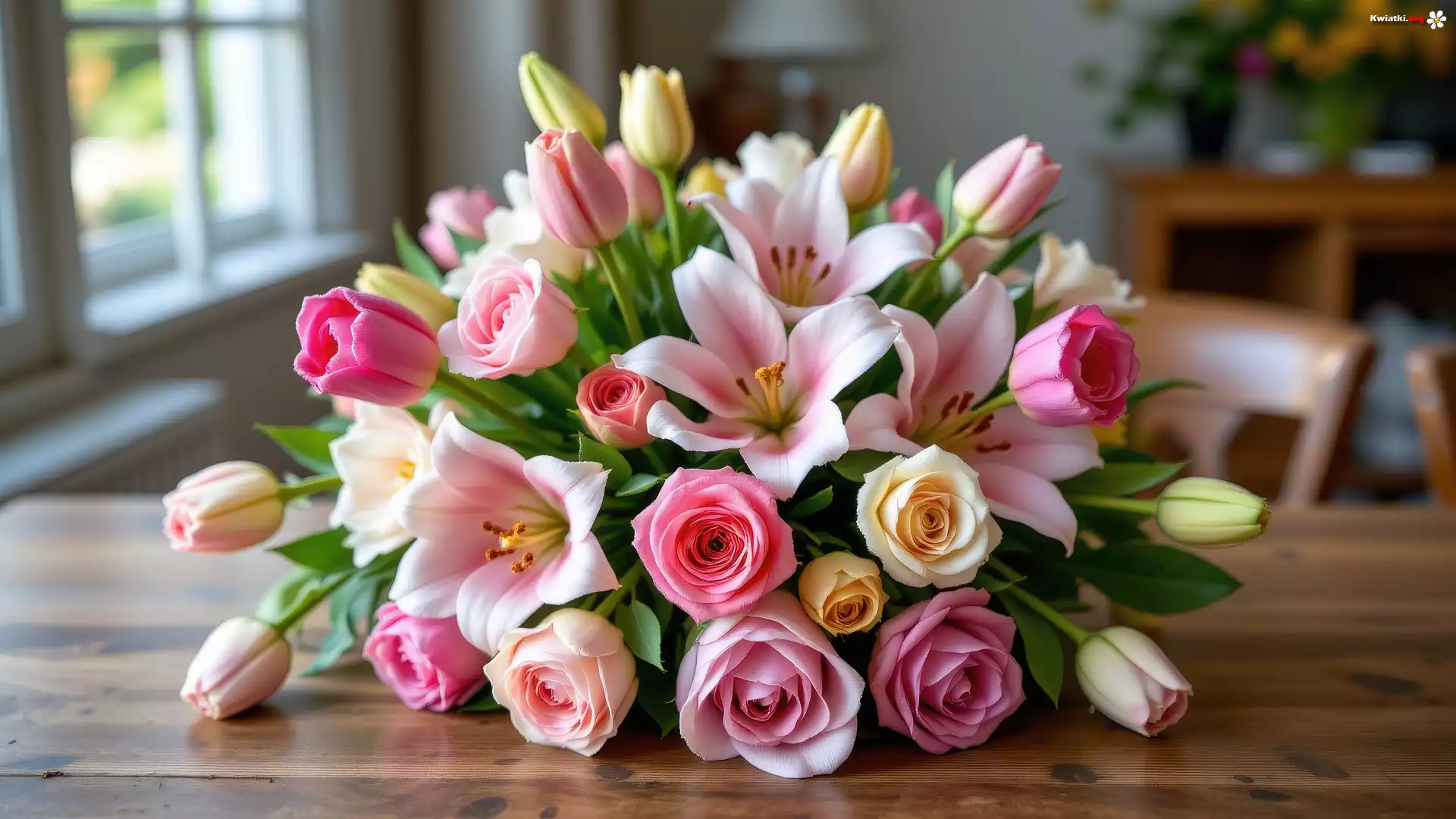 Kwiaty, Róże, Lilie, Tulipany, Bukiet, Stół, Okno, AI - Zdjęcia
