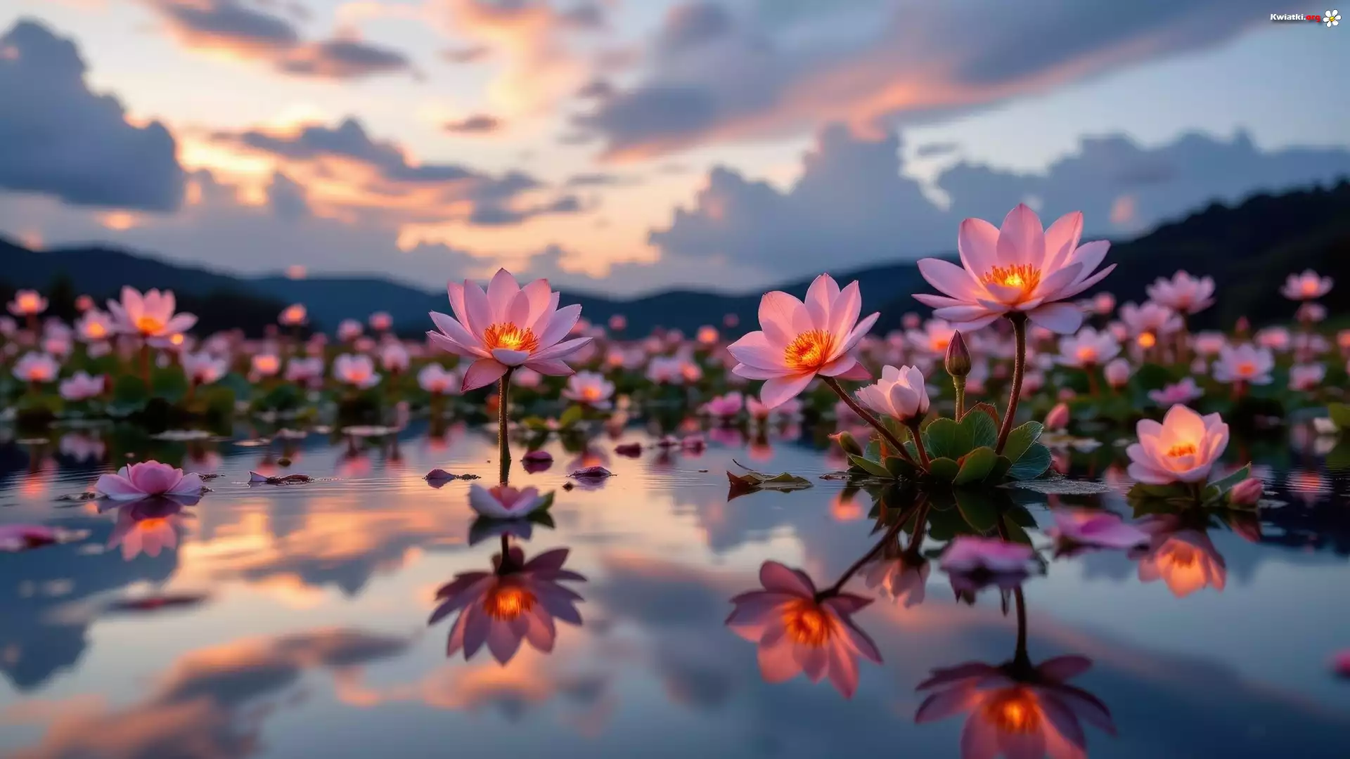 Różowe, Kwiaty, Jezioro, AI - Zdjęcia