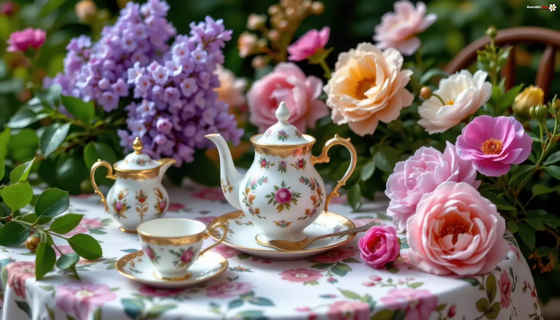 Filiżanka, Dzbanek, Talerzyki, Stolik, Kwiatowy, Obrus, Kwiaty, AI - Zdjęcia