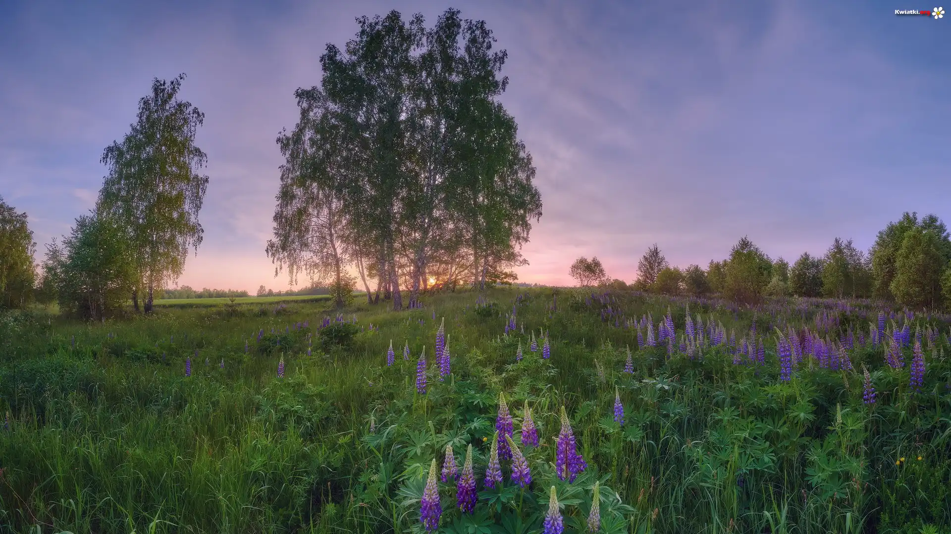 Łąka, Zielona, Trawa, Fioletowy, Łubin, Drzewa - Zdjęcia