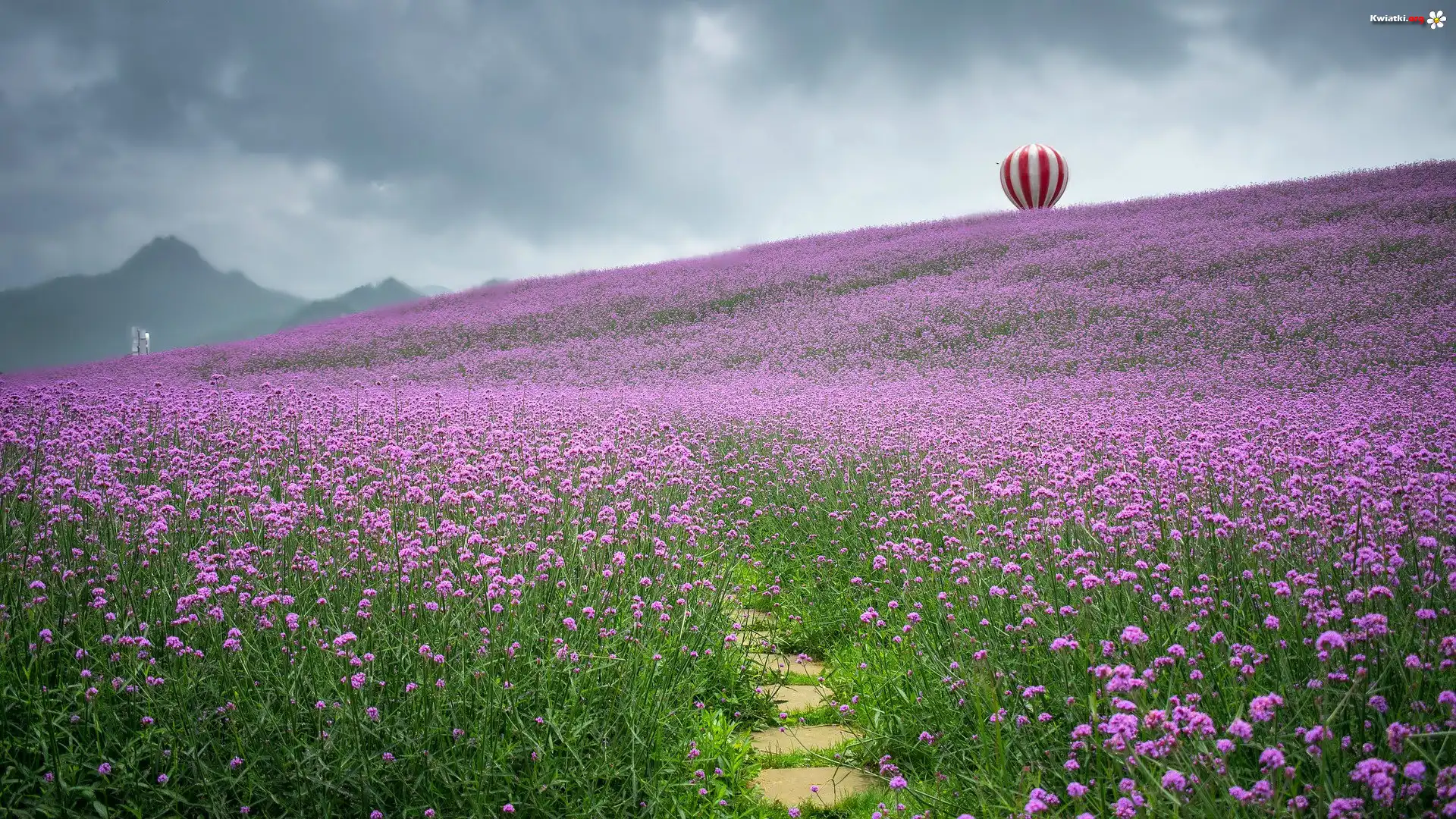 Łąka, Kwiaty, Werbena patagońska, Balon, Góry - Zdjęcia