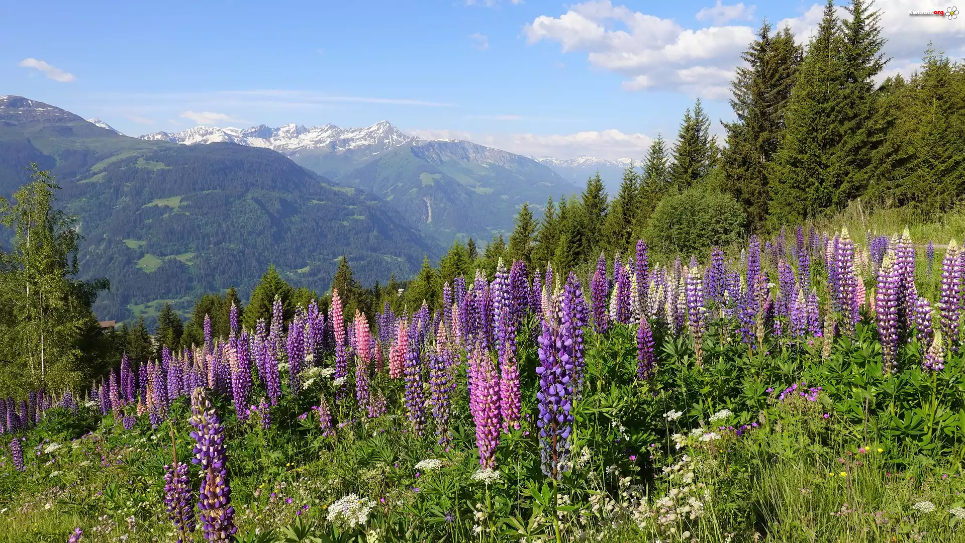 Łąka, Kwiaty, Łubin, Wzgórze, Drzewa, Góry - Zdjęcia