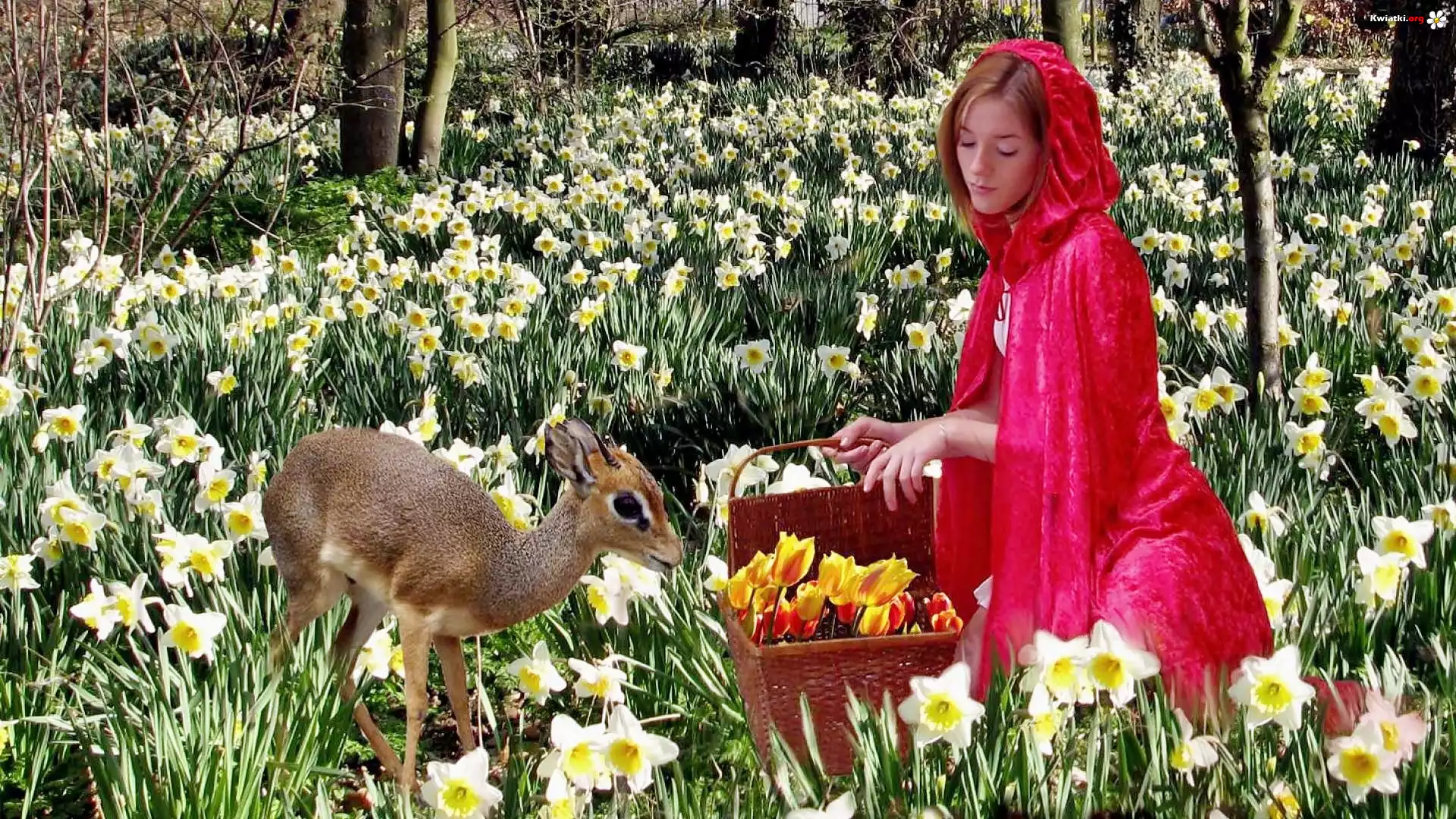 Łąka, Żonkili, Dziewczyna, Kosz, Tulipanów, Sarenka - Zdjęcia