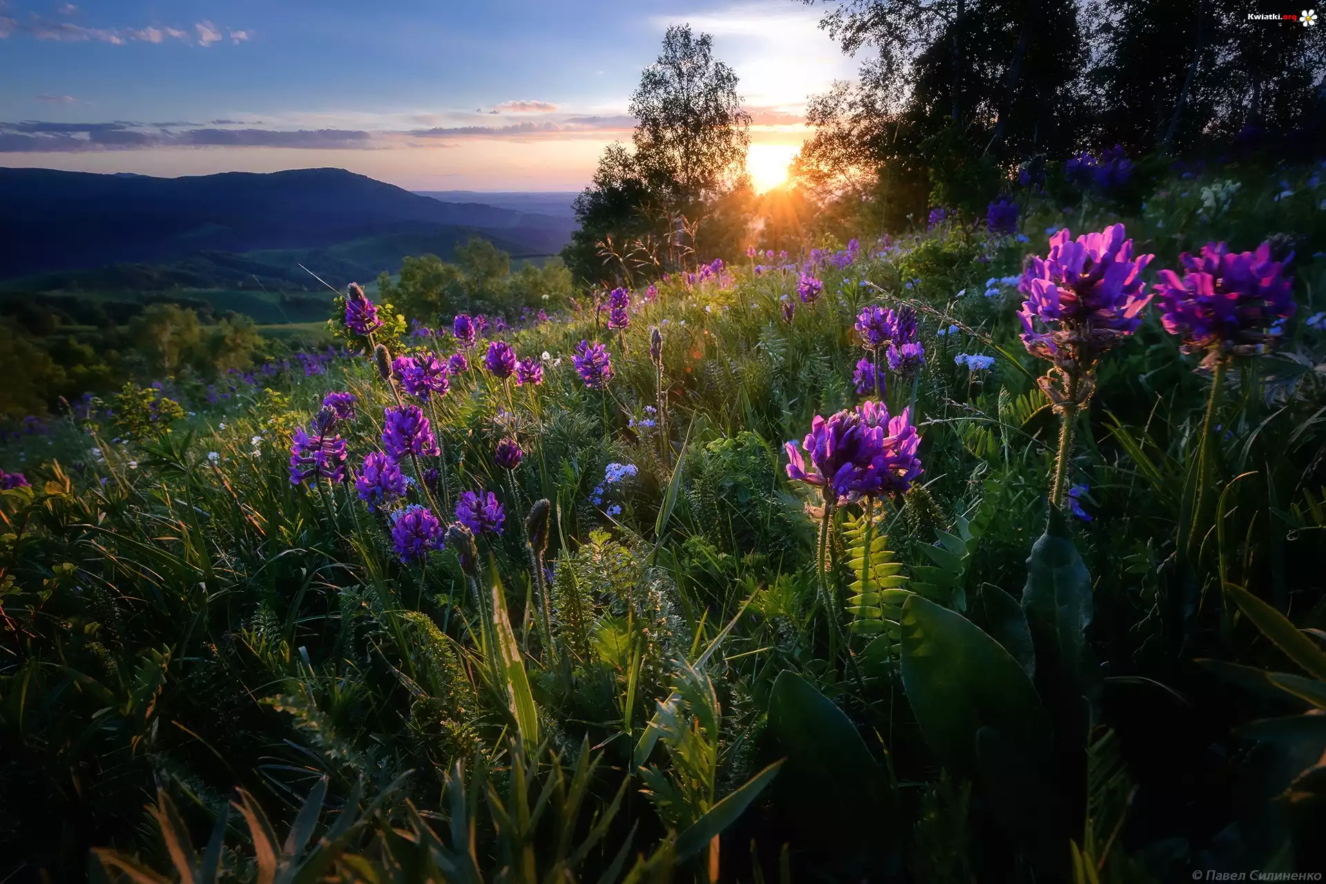 Łąka, Kwiaty, Traganek, Wzgórze, Promienie słońca - Zdjęcia