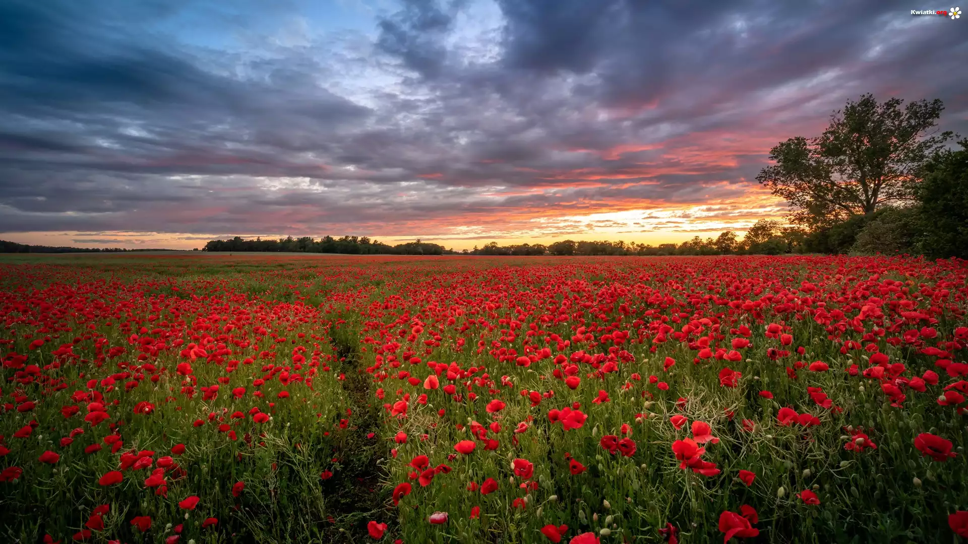 Kwiat Łąka, Czerwone, Maki, Drzewa, Wschód słońca, Chmury