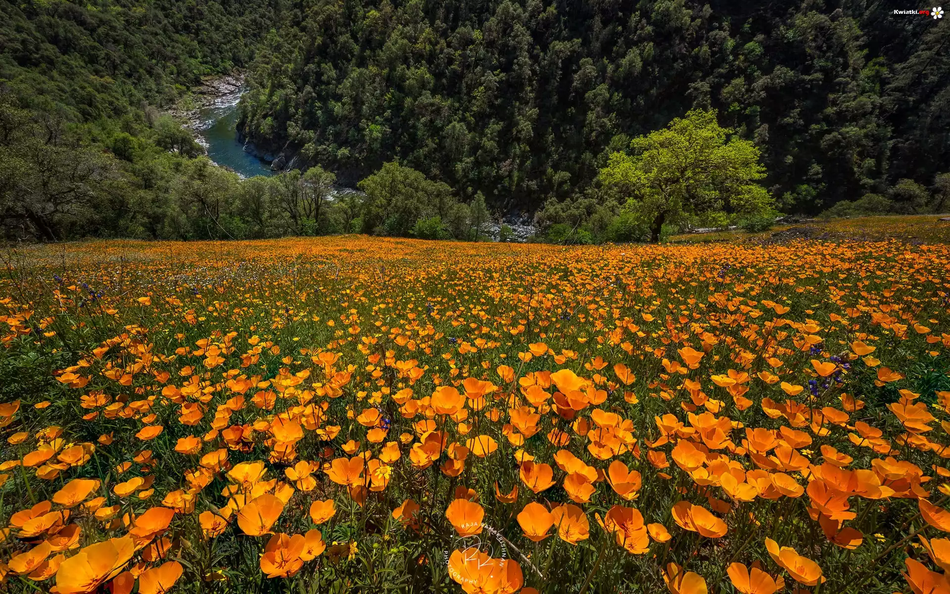 Kwiat Łąka, Maczki kalifornijskie, Pozłotki, Rzeka, Las, Drzewa