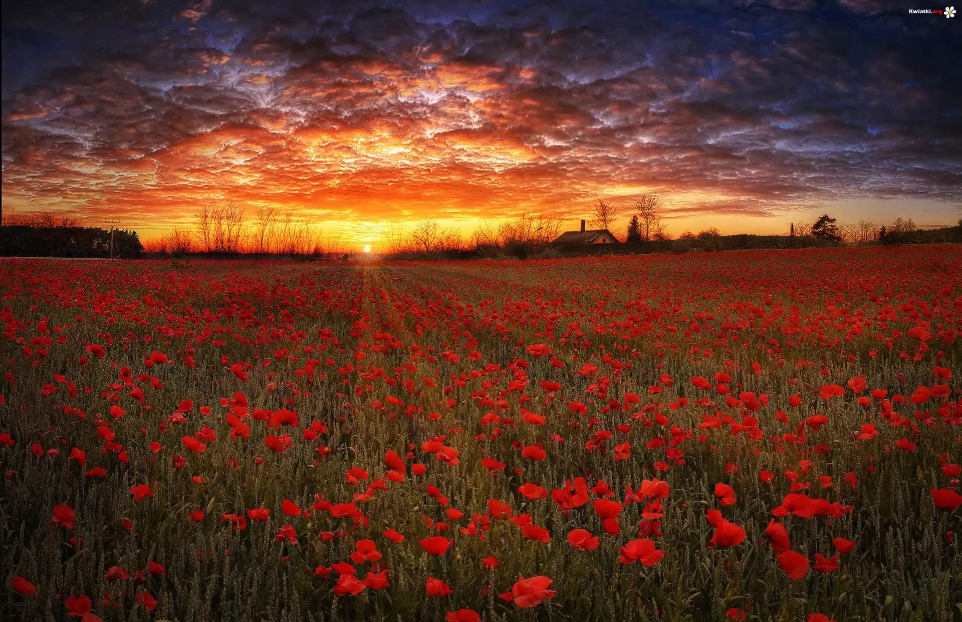 Kwiat Niemcy, Meklemburgia-Pomorze Przednie, Maki, Zachód słońca, Chmury, Drzewa, Łąka