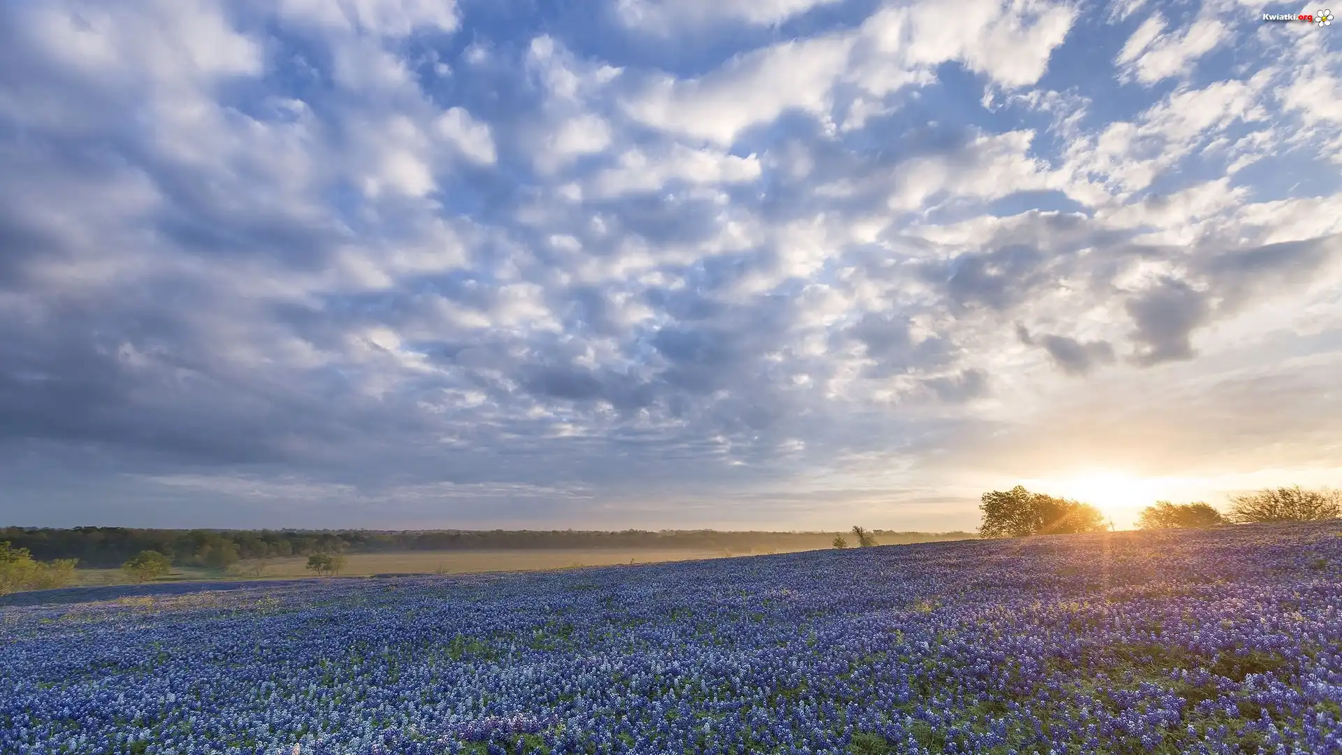 Stany Zjednoczone, Stan Teksas, Ennis, Łąka, Kwiaty, Łubin niebieskolistny, Wschód słońca, Drzewa - Zdjęcia |