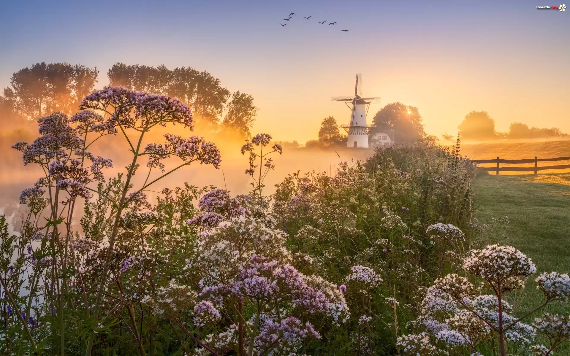 Wiatrak, Łąka, Kwiaty, Drzewa, Mgła, Lato, Ptaki - Zdjęcia