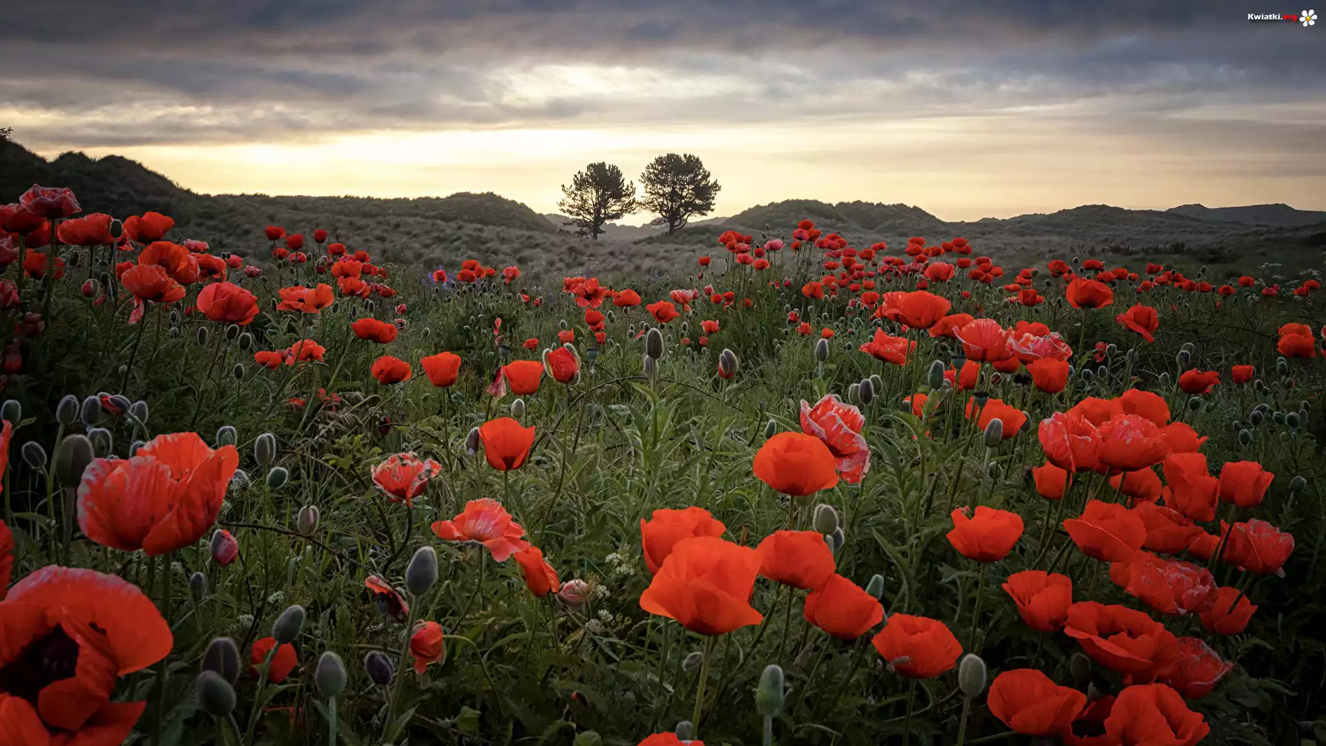 Kwiat Łąka, Maki, Wschód słońca, Drzewa, Chmury, Wzgórza
