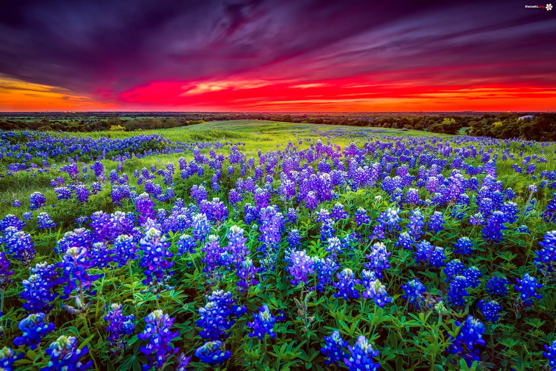 Pastwiska, Łąki, Łubin, Drzewa, Zachód, Słońca, Teksas, USA - Zdjęcia