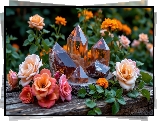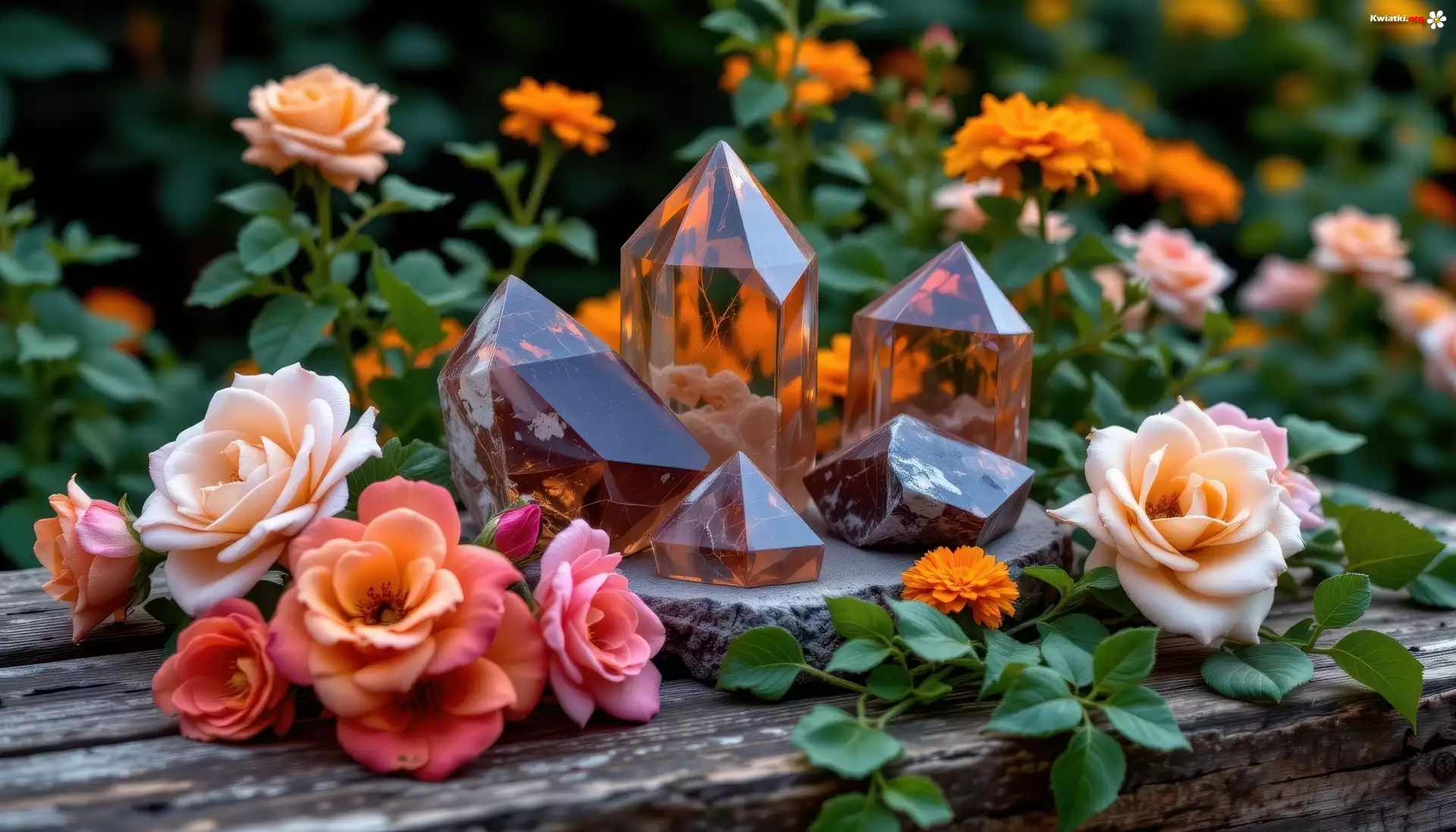 Kryształy, Kwiaty, Róże, Aksamitki, Bluszcz, Deski - Zdjęcia