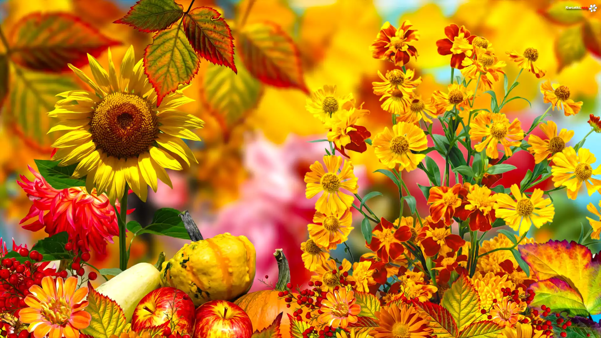 Kwiaty, Aksamitki, Dynie, Jabłka, Słonecznik, Liście, 2D - Zdjęcia