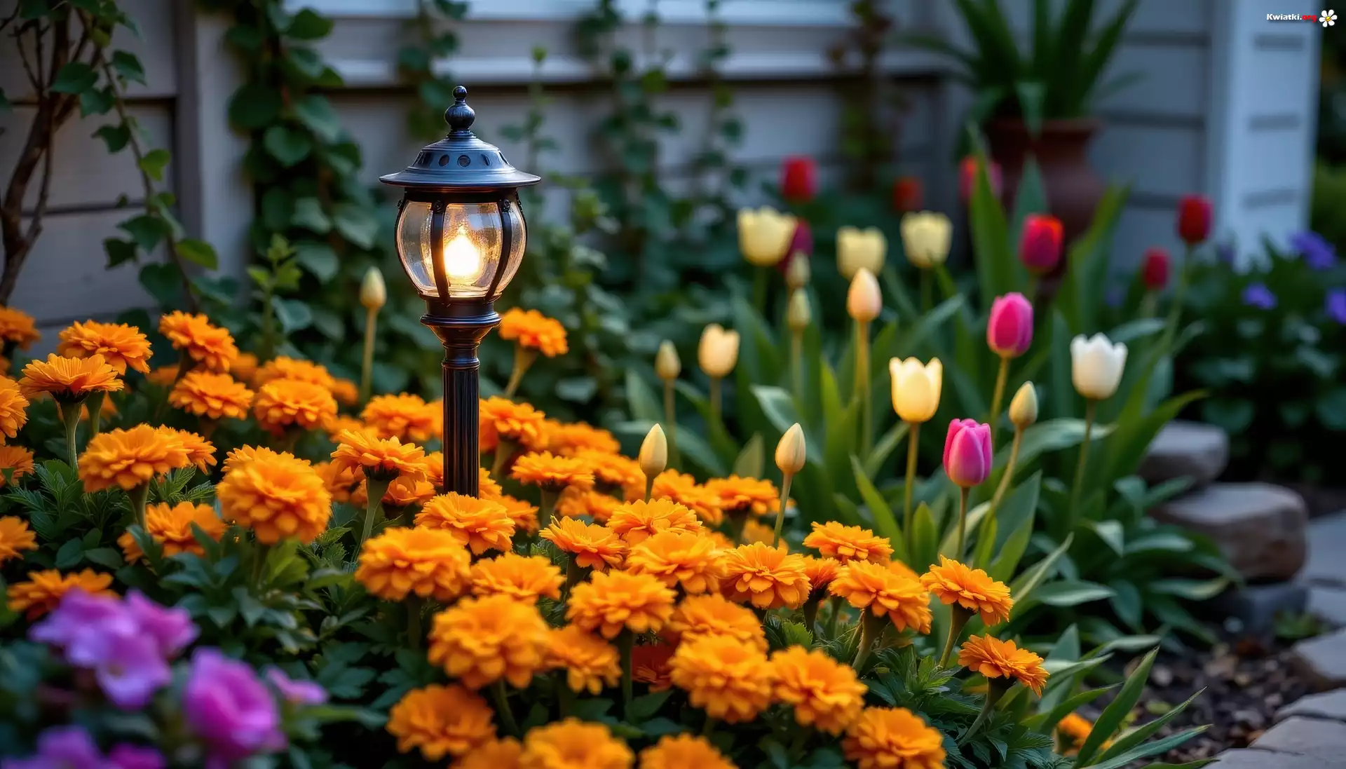 Kwiat Ogród, Latarnia, Kwiaty, Aksamitki, Tulipany, Bluszcz, AI