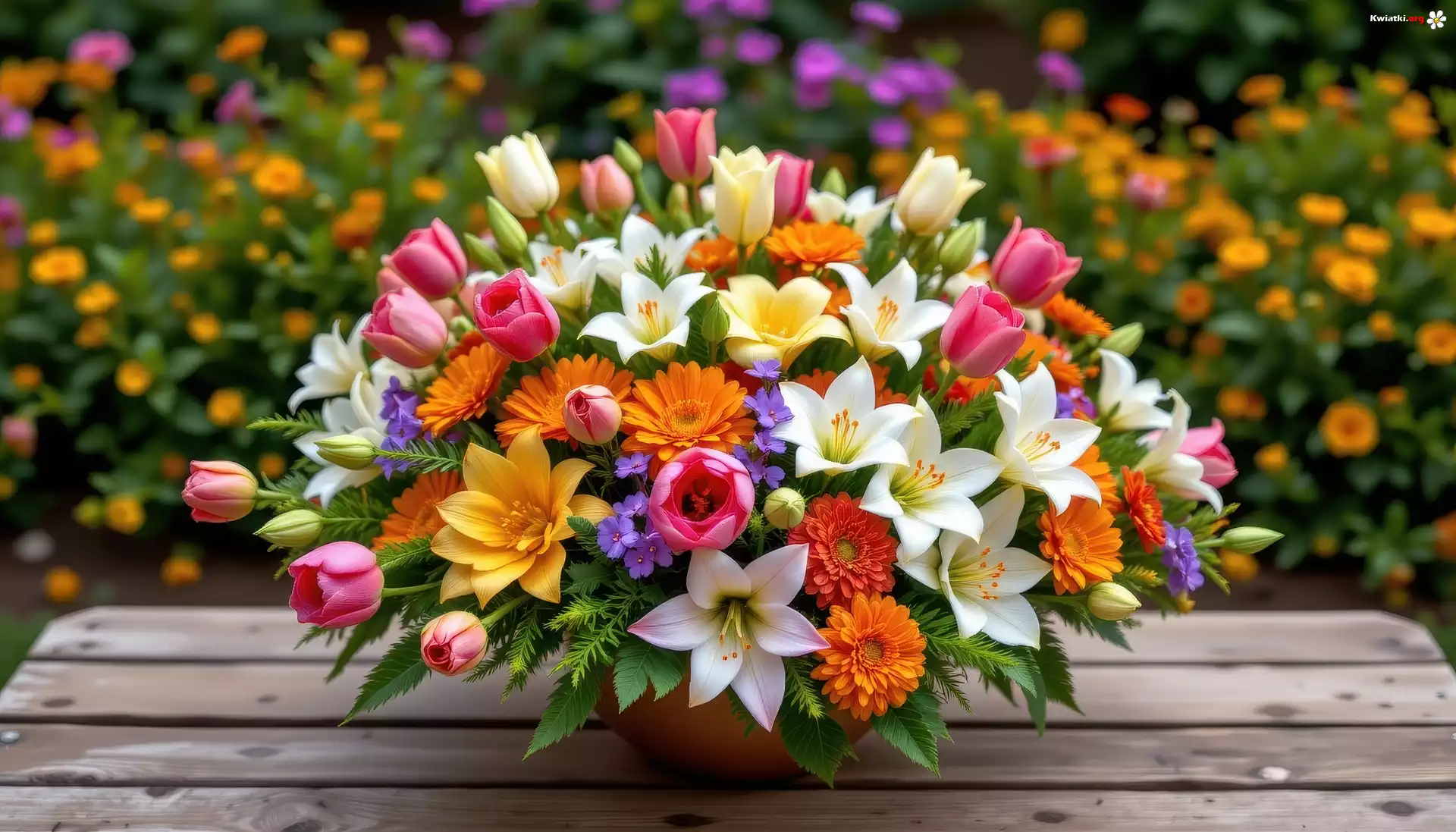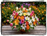 Kwiaty, Tulipany, Lilie, Aksamitki, Wazon, Stół, Bukiet - Zdjęcia