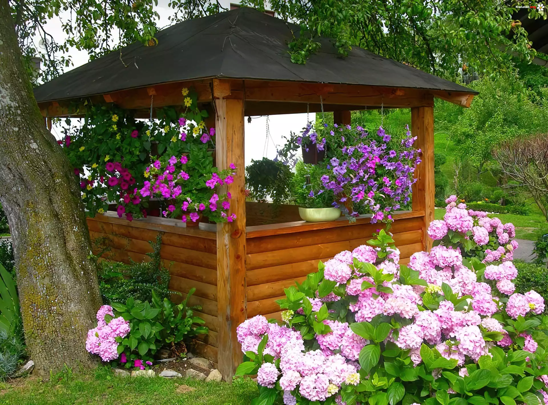 Ogród, Altanka, Kwiaty, Surfinia, Hortensja - Zdjęcia