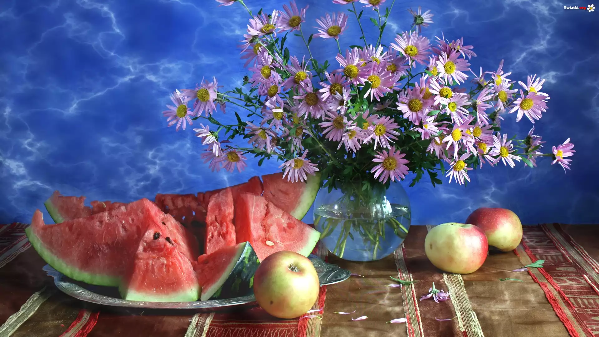 Arbuz, Jabłka, Bukiet, Kwiatów, Talerz - Zdjęcia