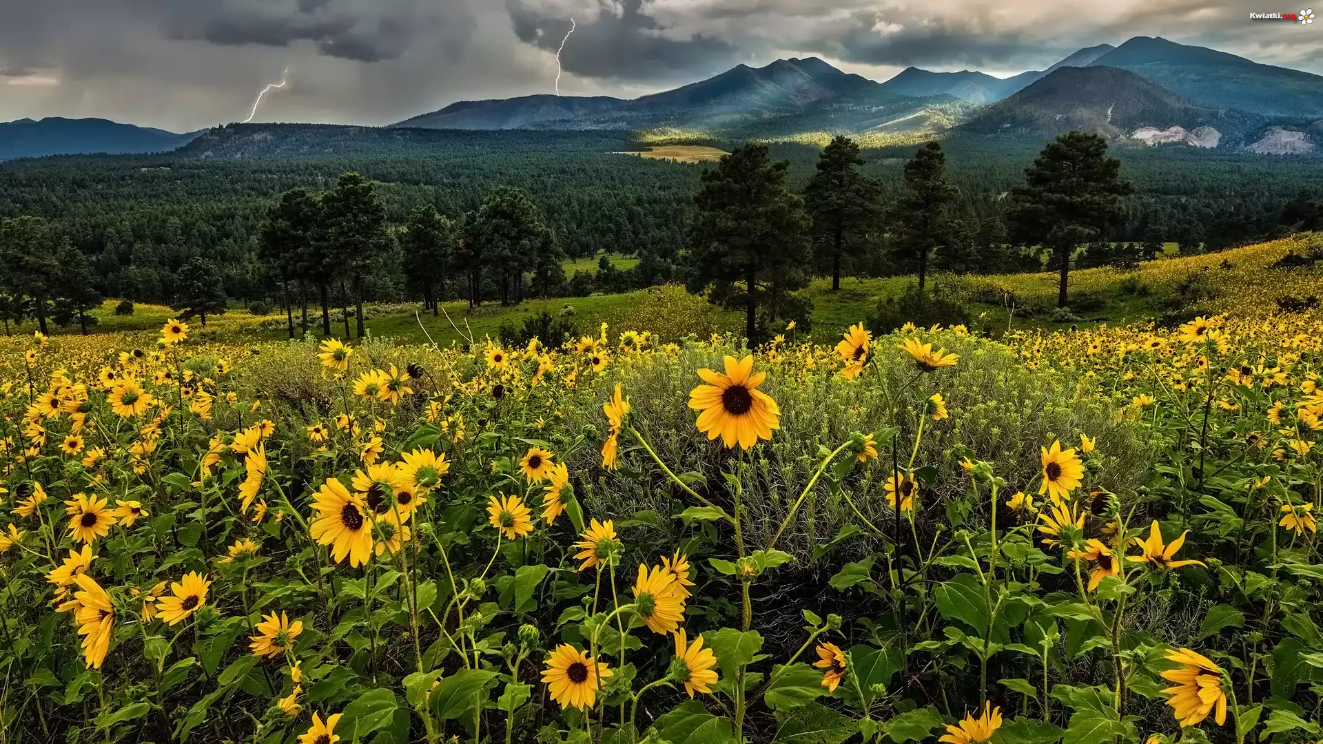 Żółte, Kwiaty, Góry, San Francisco Peaks, Drzewa, Chmury, Piorun, Arizona, Stany Zjednoczone - Zdjęcia |