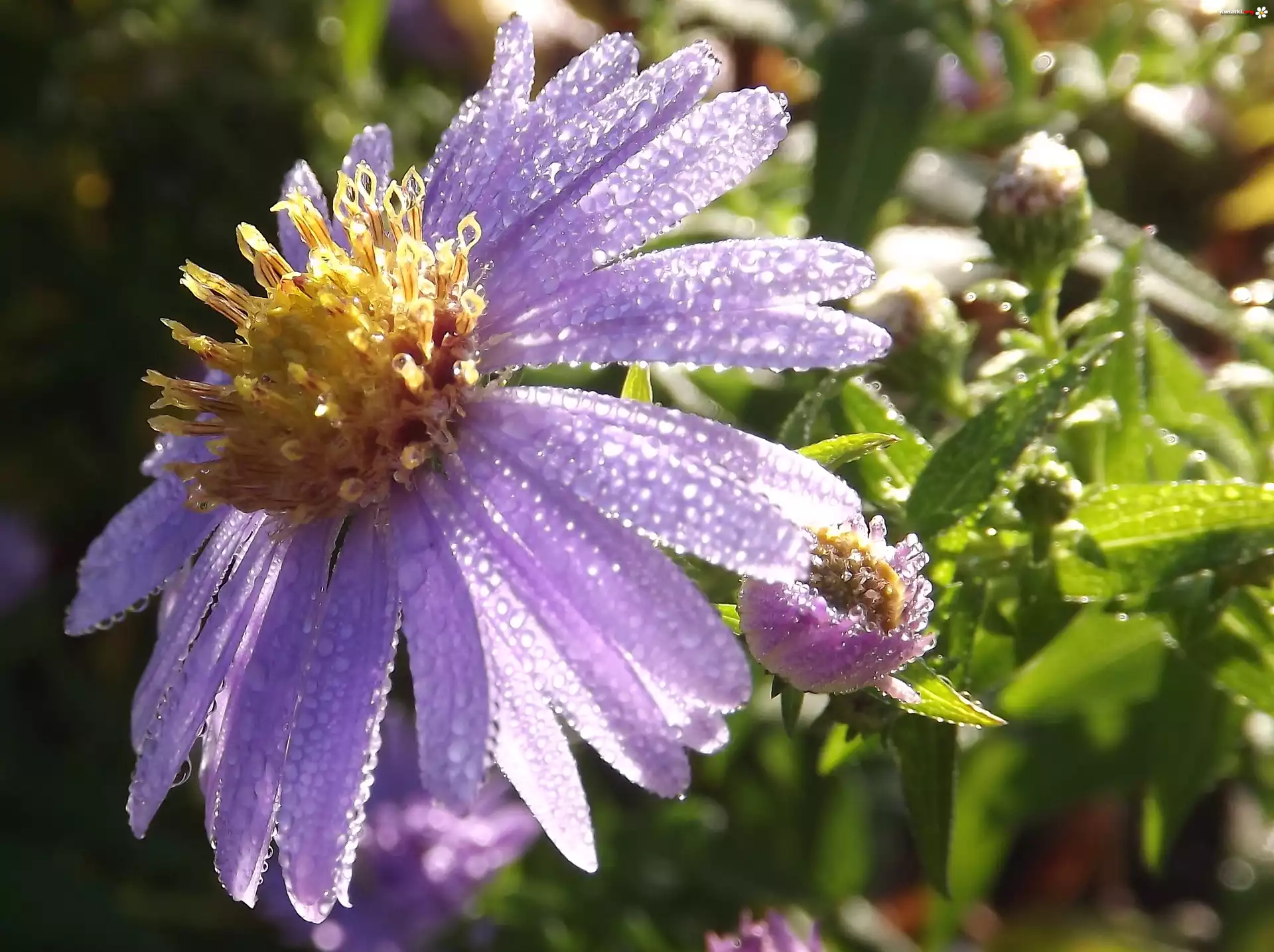 Kwiat Aster, Fioletowy, Kropelki, Rosy