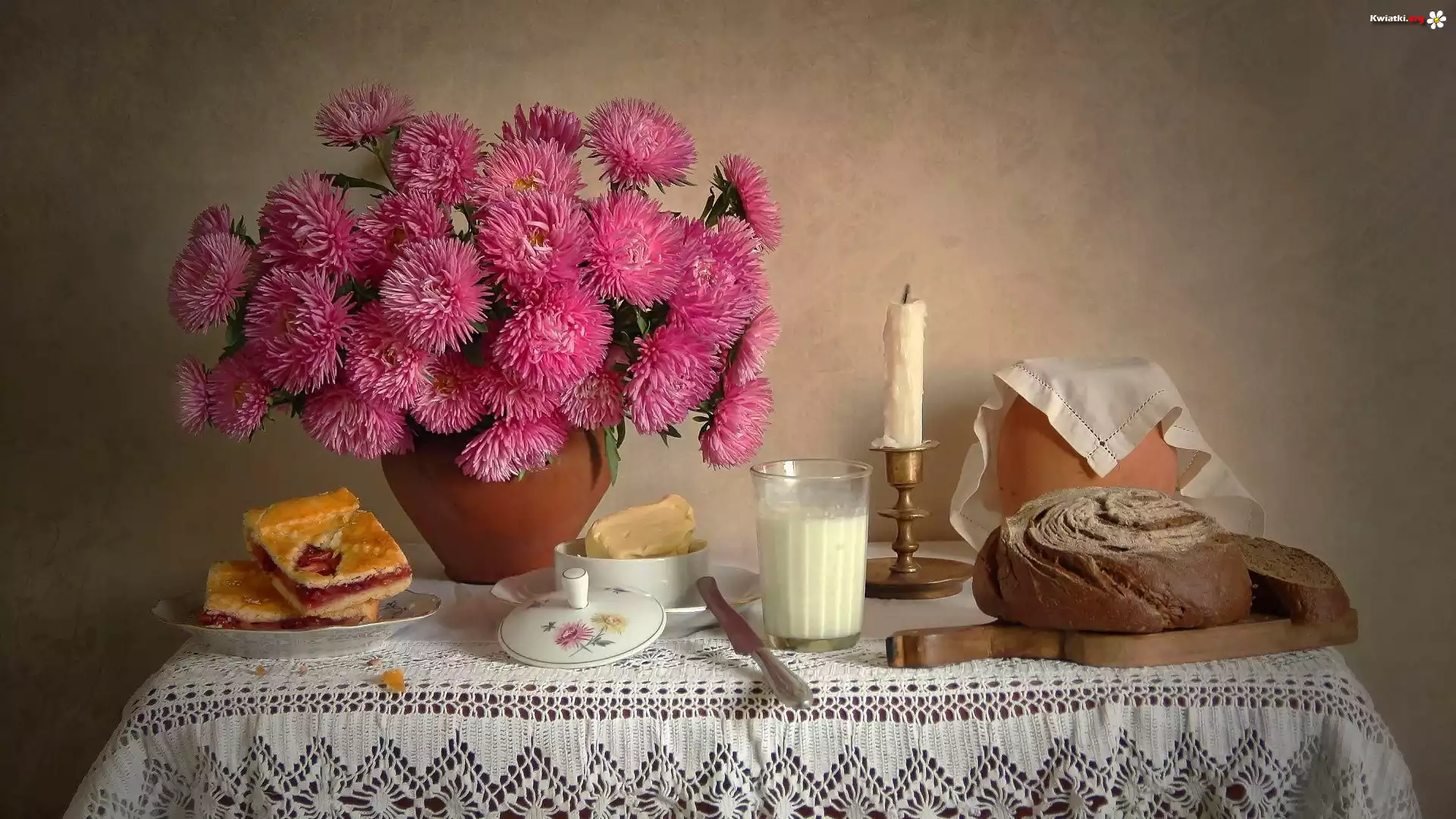Kwiat Kompozycja, Bukiet, Astry, Ciasto, Chleb, Szklanka, Mleko, Masło, Świeczka, Nóż, Serweta