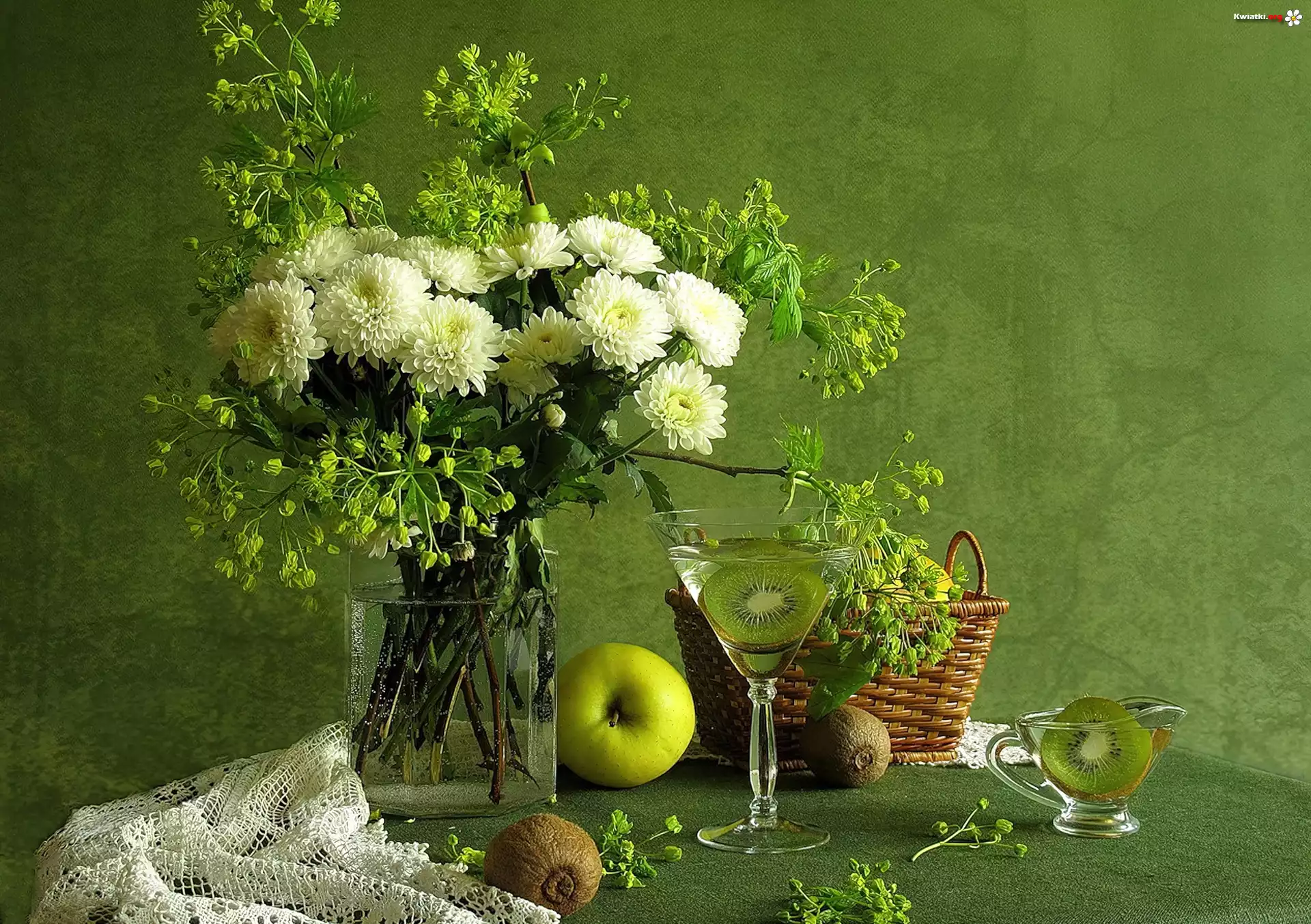 Bukiet kwiatów, Chryzantemy, Kompozycja, Jabłko, Kiwi - Zdjęcia