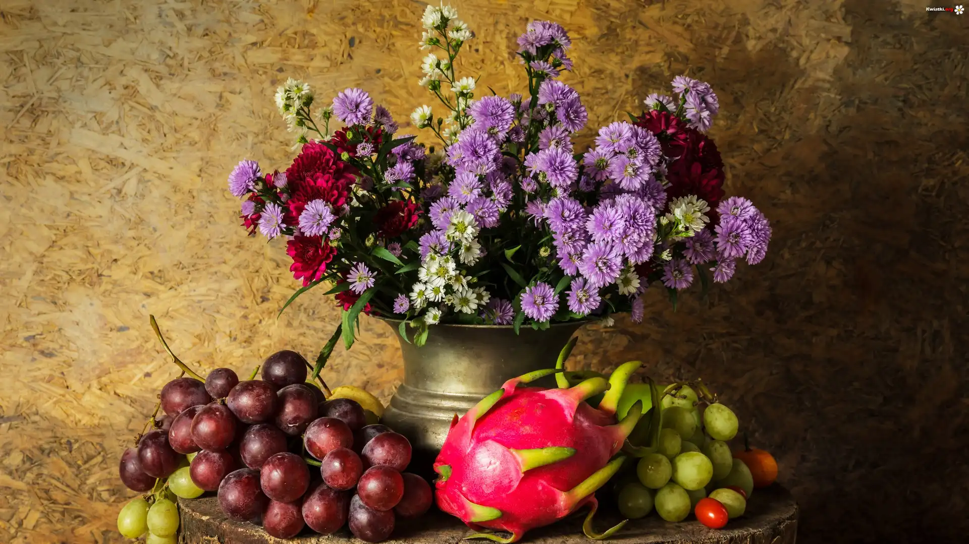 Kwiaty, Astry marcinki, Bukiet, Wazon, Owoce, Winogrona - Zdjęcia