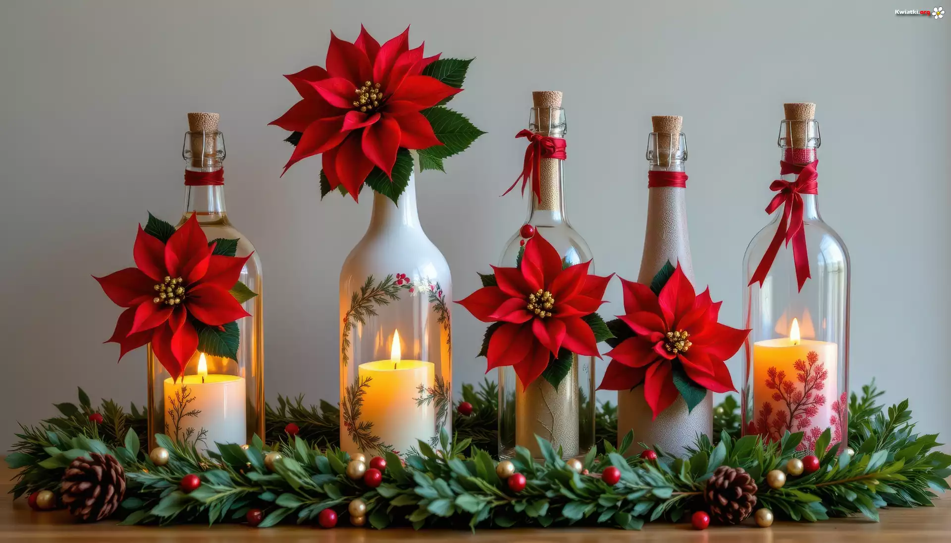 Butelki, Kwiaty, Gwiazda betlejemska, Świece, Świąteczne - Zdjęcia