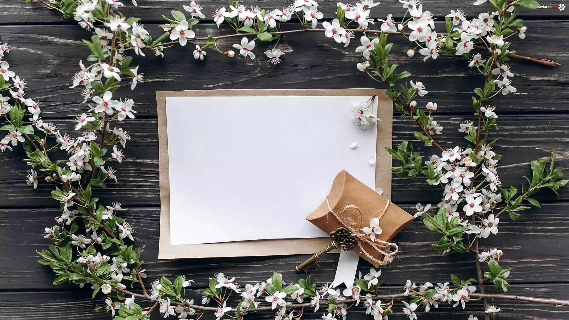 Kwiat Kartka, Biała, Prezencik, Klucz, Gałązki, Białe, Kwiatki, Deski