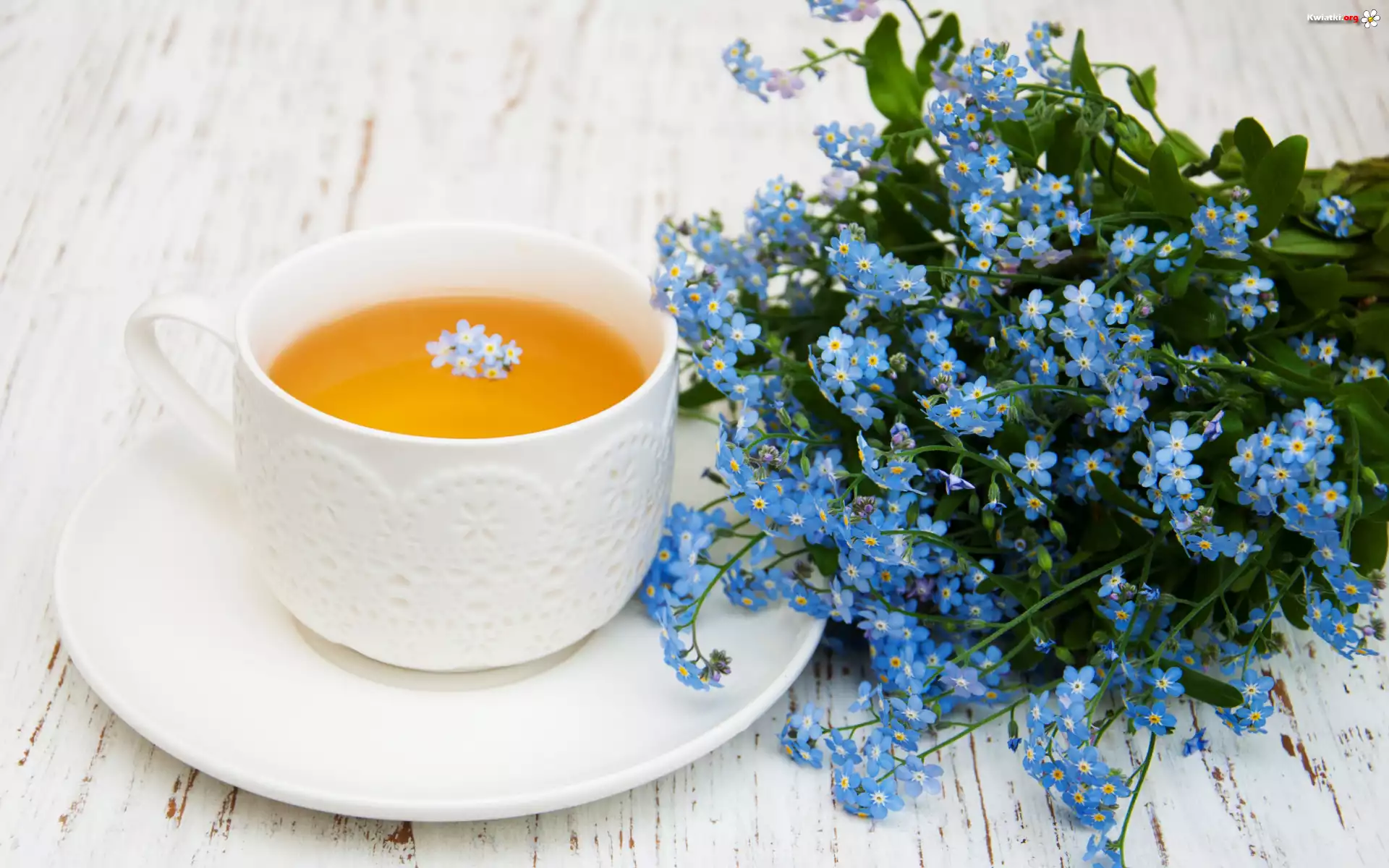 Kwiat Herbata, Biała, Filiżanka, Talerzyk, Kwiaty, Niezapominajki, Deski