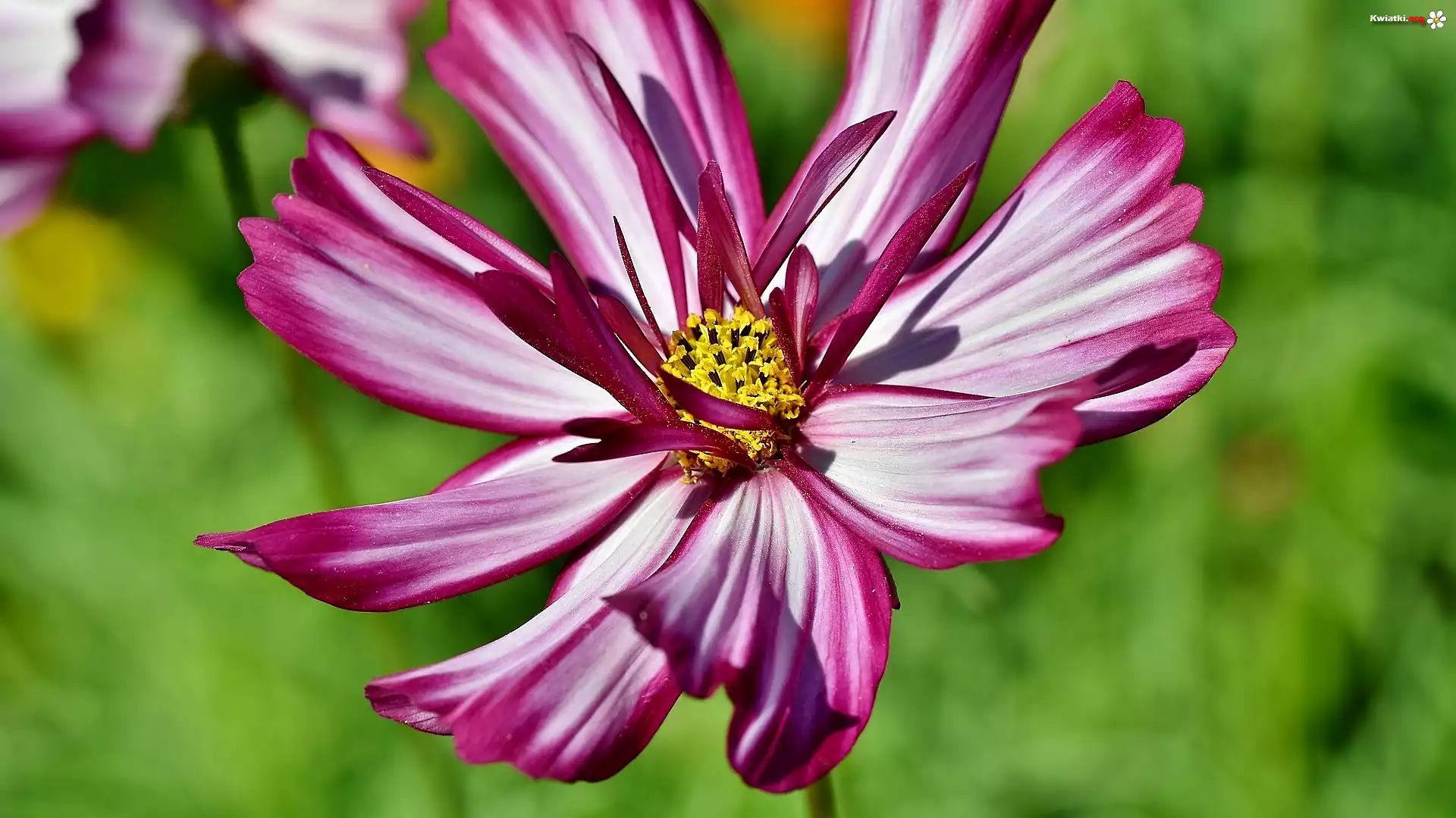 Różowo-biała, Kosmea, Żółte, Pręciki, Rozmyte, Tło - Zdjęcia