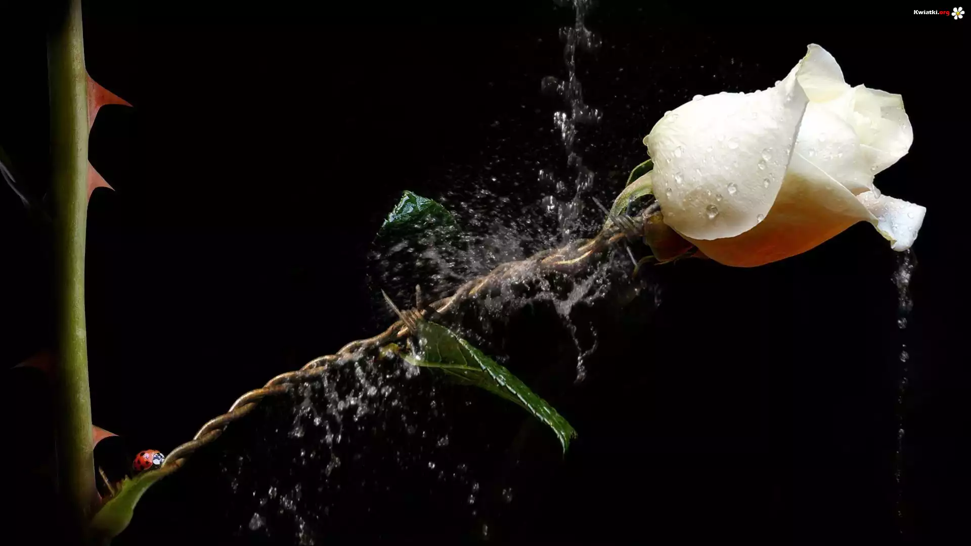 Biała, Róża, Krople, Woda, Biedronka - Zdjęcia