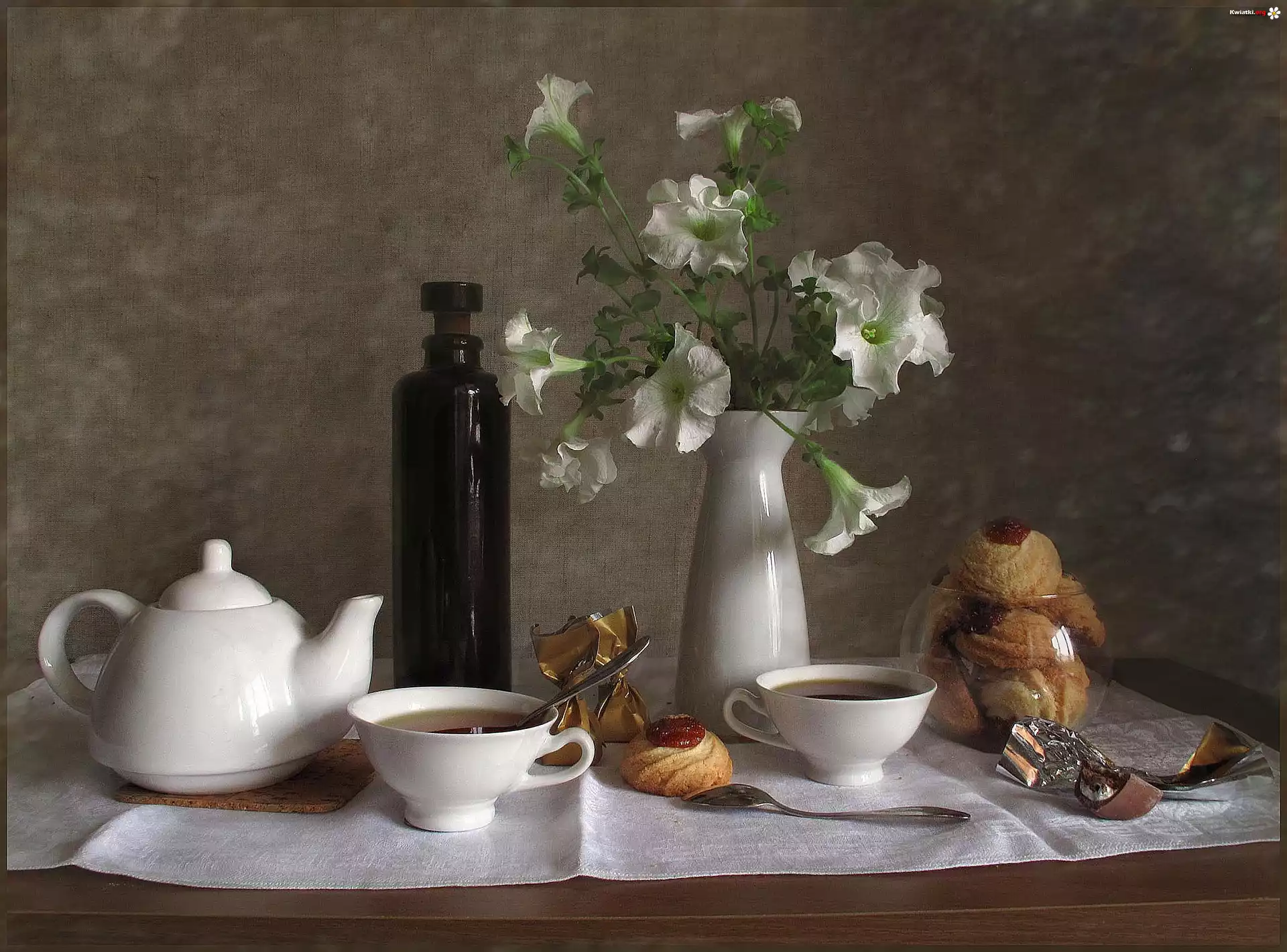 Białe, Kwiaty, Ciasteczka, Herbatka - Zdjęcia