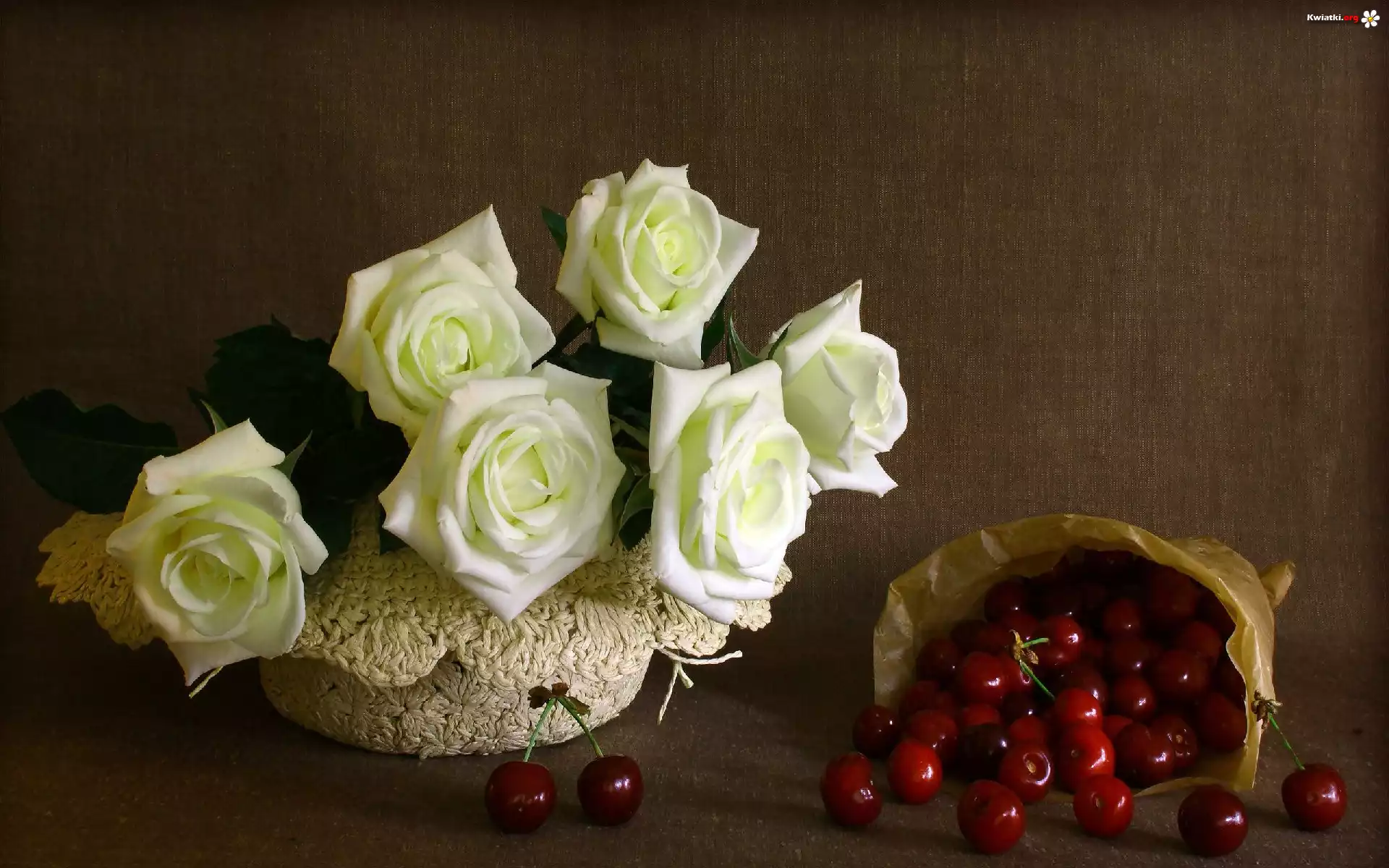 Białe, Róże, Kapelusz, Wiśnie - Zdjęcia