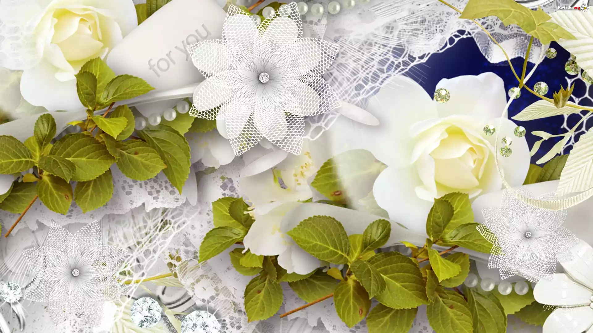Białe, Róże, Zielone, Listki, Koronki, Dekoracja - Zdjęcia