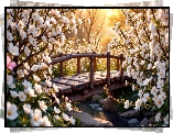 Mostek, Drewniany, Kwiaty, Białe, Promienie słońca, AI - Zdjęcia