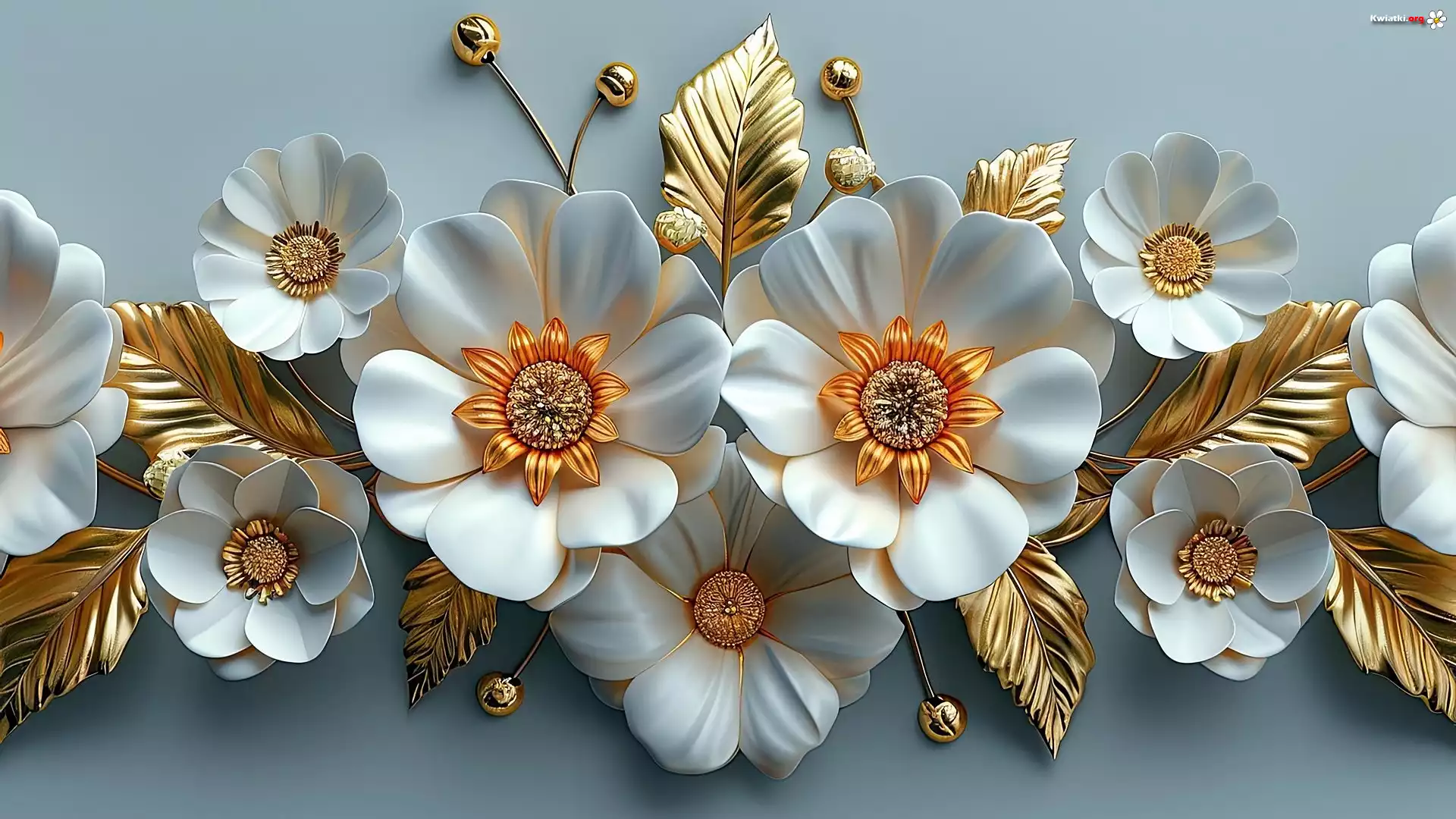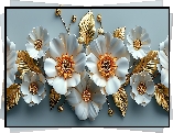 Grafika, Białe, Kwiaty, Złote, Listki - Zdjęcia