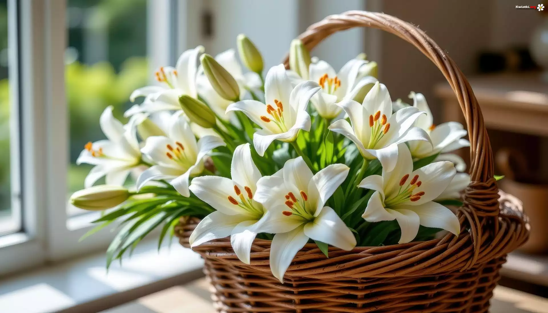 Kwiaty, Białe, Lilie, Koszyk, Okno - Zdjęcia