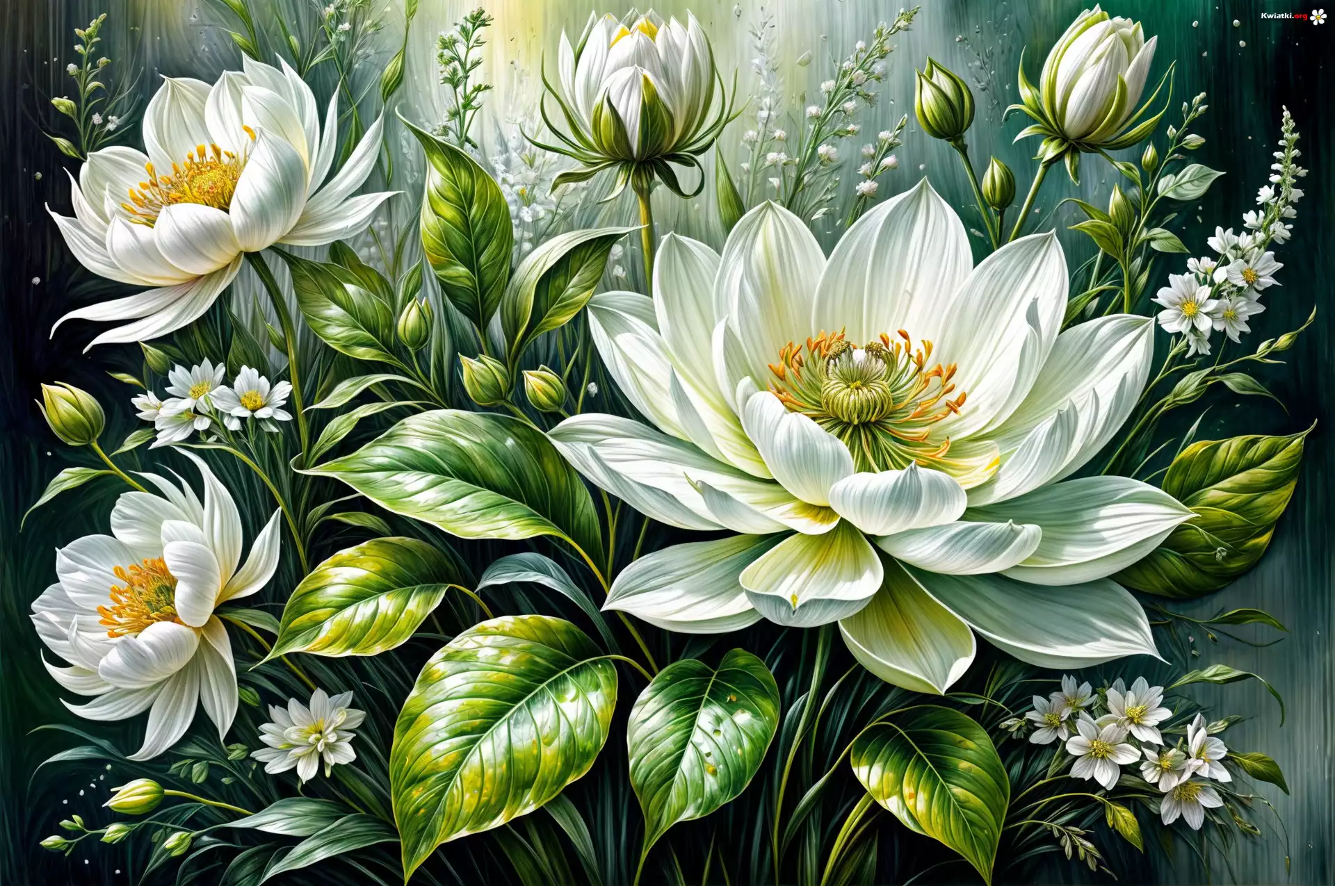 Kwiaty, Białe, Liście, Pąki, Grafika - Zdjęcia