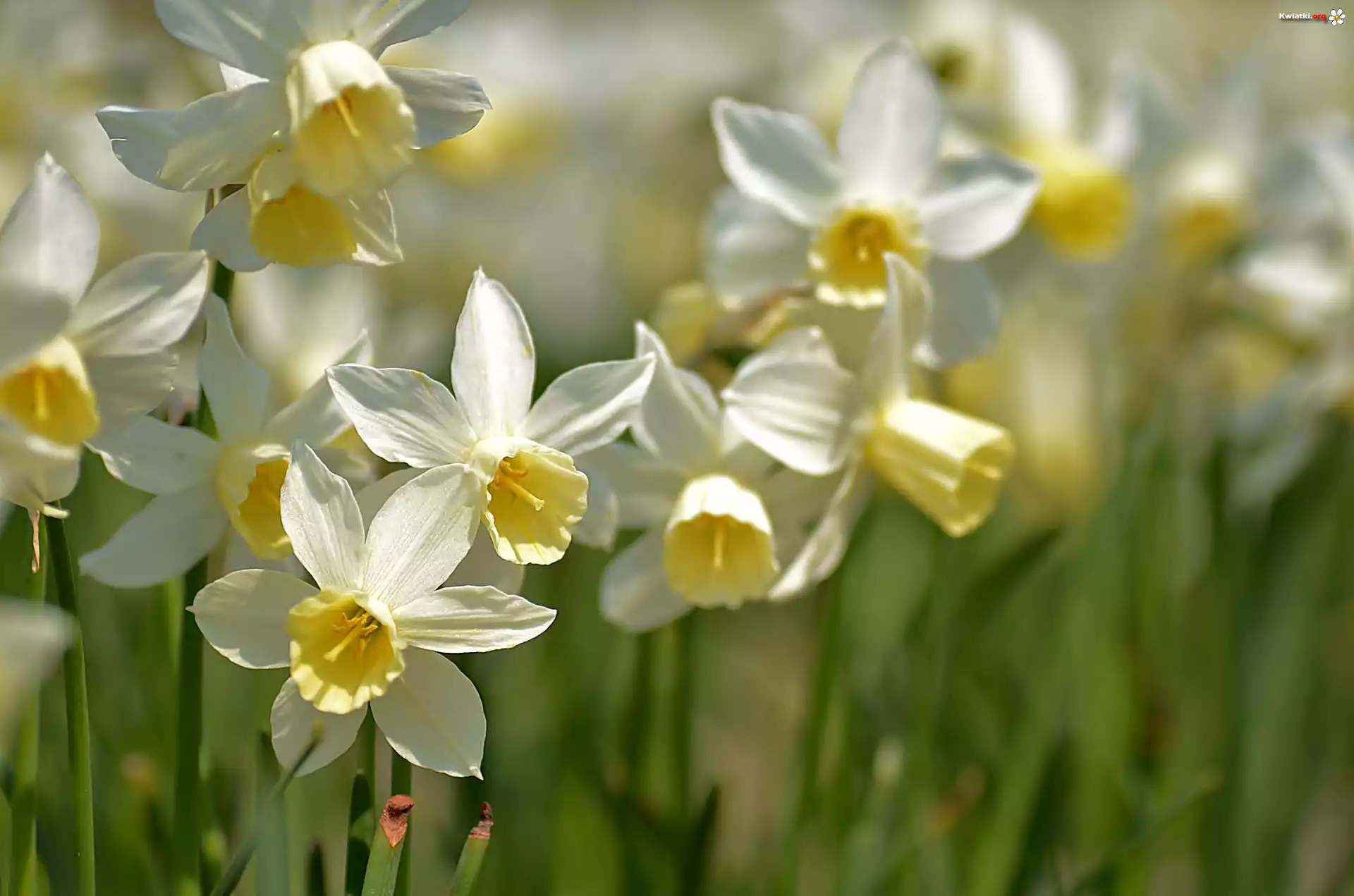 Kolorowe, Kwiaty, Wiosenne Narcyze, Polana, Trawy, Drzewa Mieszaniec tazetta Piękne, Narcyze Trzy, Żonkile, Liście Biały, Narcyz Narcyz, Kwiat Białe, Żółte, Żonkile Żółte, Narcyzy Żółte, Żonkile Narcyz, Zielony, Listek Narcyze Białe, Żonkile Żonkil, Zielone, Listki