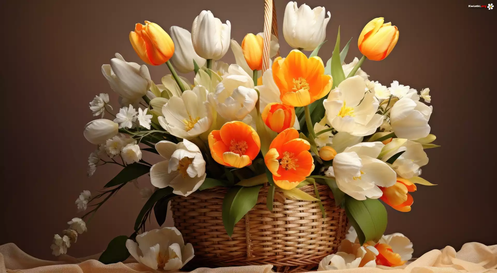 Kwiaty, Białe, Pomarańczowe, Tulipany, Koszyk - Zdjęcia